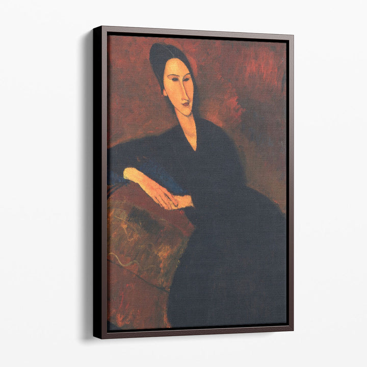 This classical abstract woman portrait uses deep black and brown hues, expressing elegance through stylized form and Modigliani’s unique artistic vision.