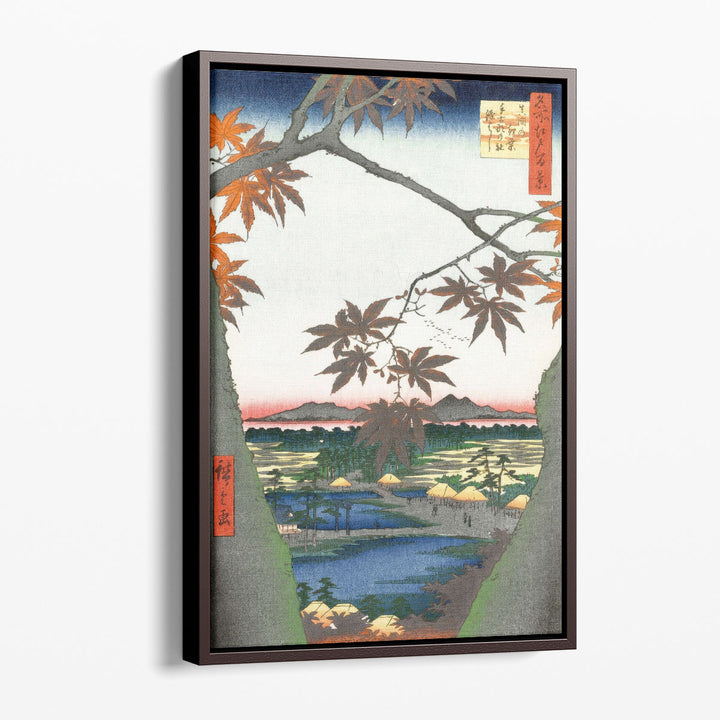 Maple Leaves, the Tekona Shrine and the Bridge Print Framed Art Print by Andō Hiroshige.