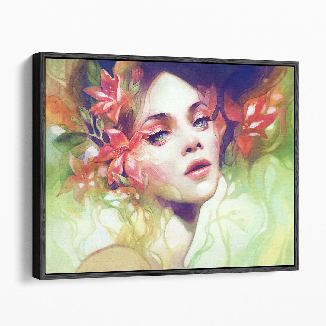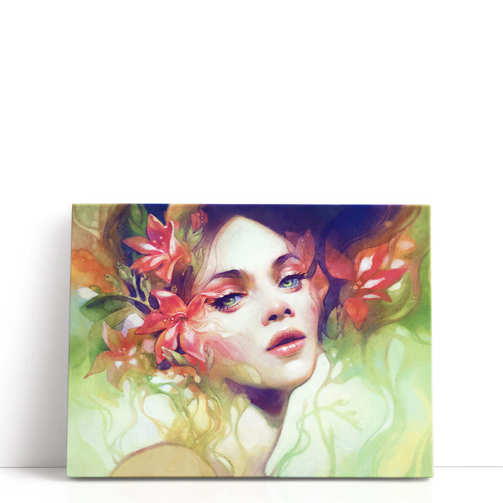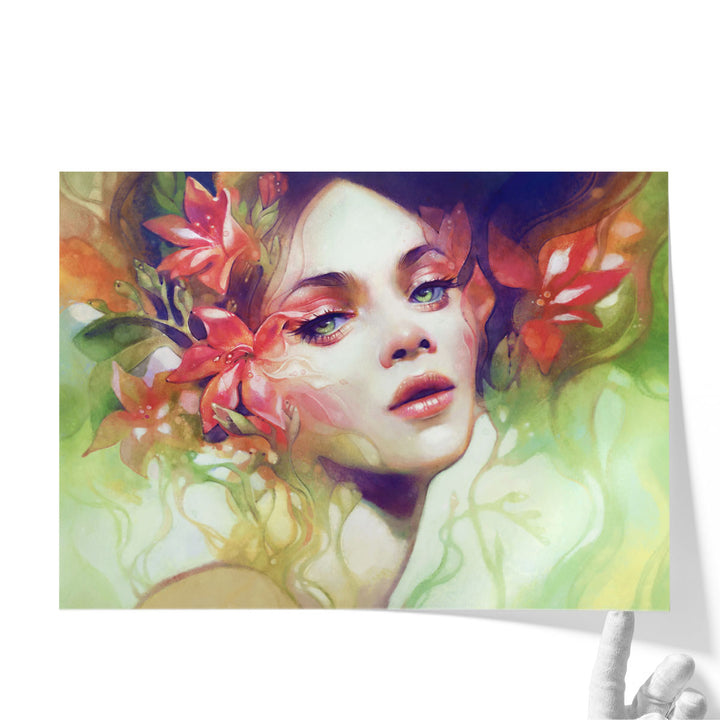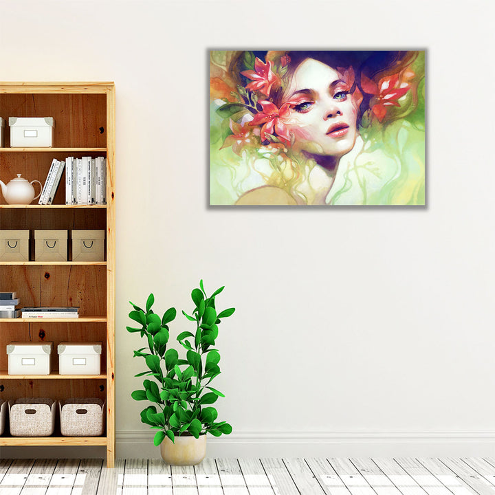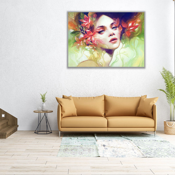 This expressive artwork features a girl adorned with blooming flowers on her head, blending fantasy portraiture with delicate, ethereal style.