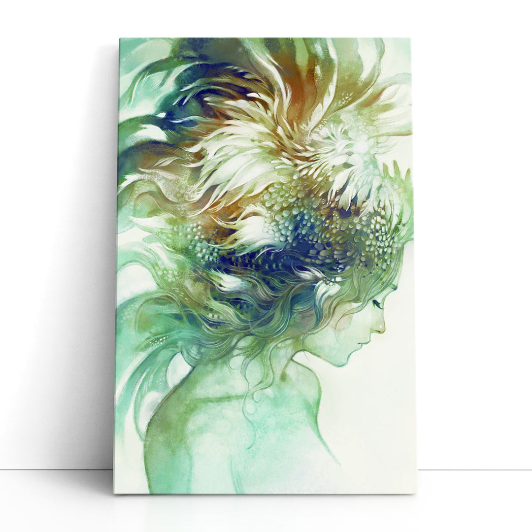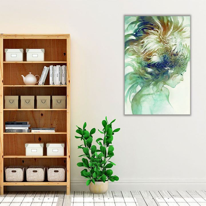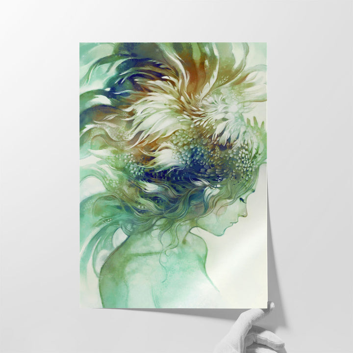 This watercolor piece portrays a serene female profile with hair transforming into soft, feathered textures, capturing delicate beauty and motion.