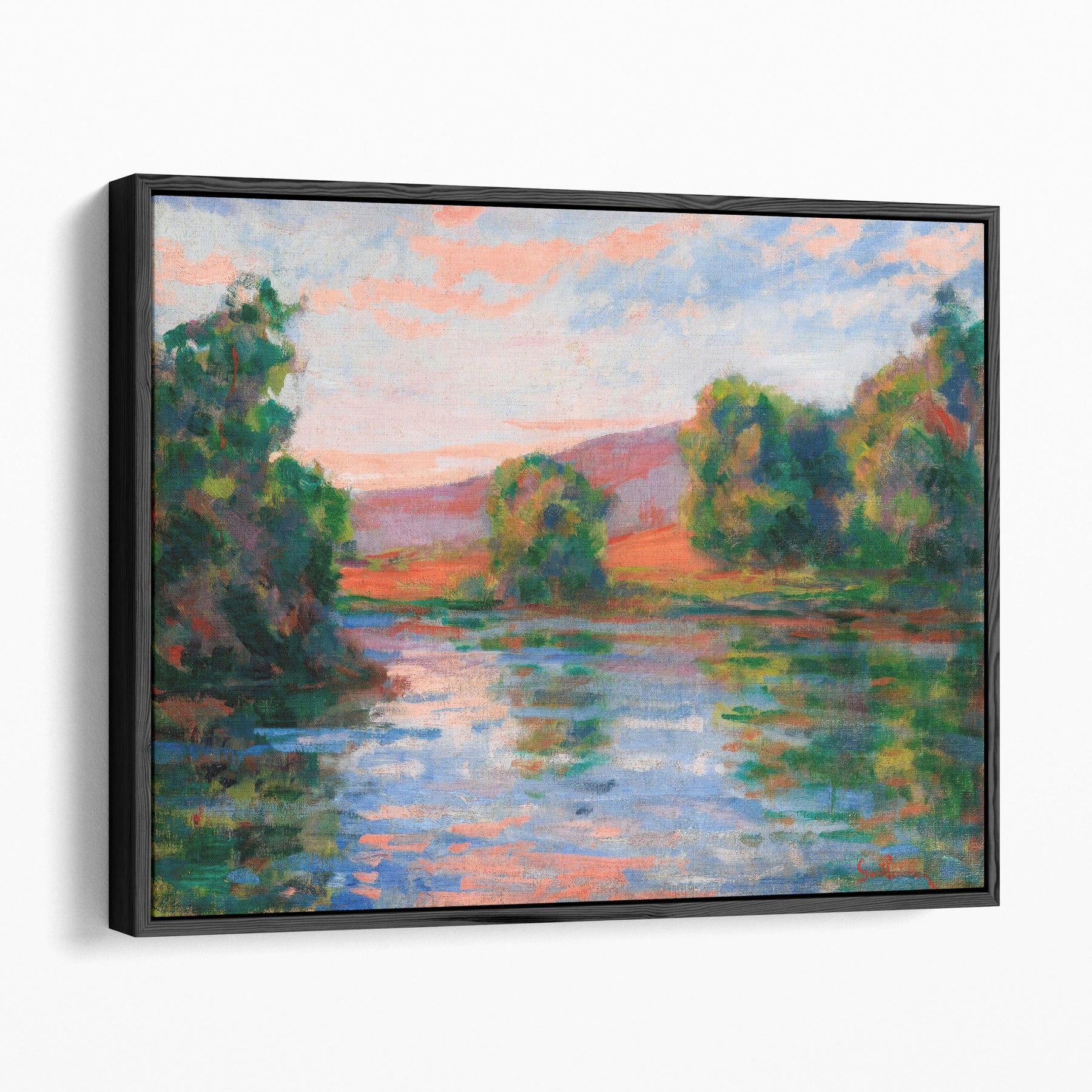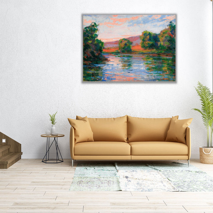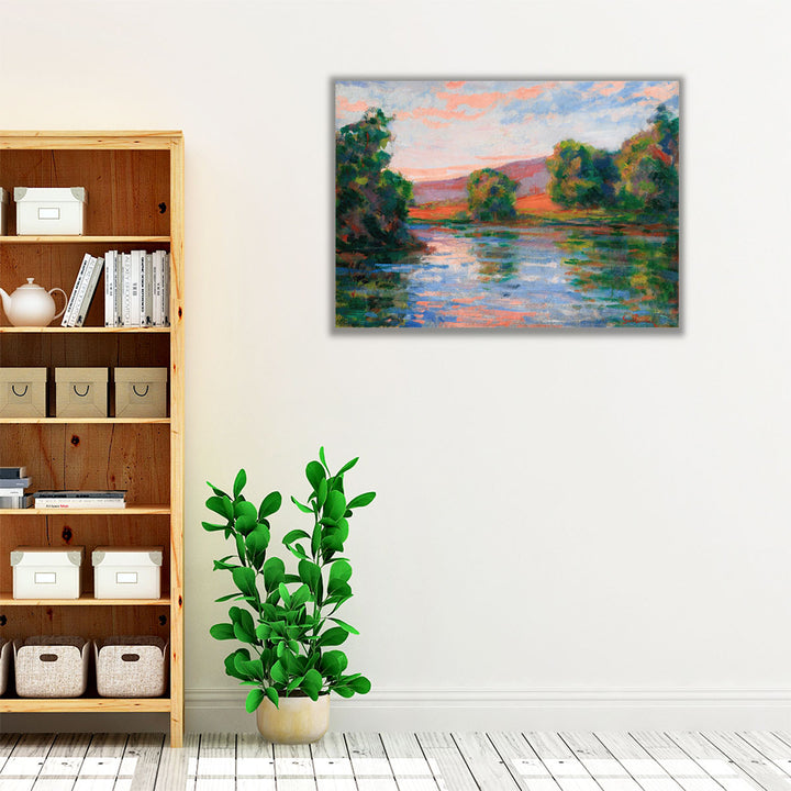 A tranquil Impressionist scene with trees and hills reflecting in calm waters beneath a radiant sky, showcasing vivid light and color harmony.