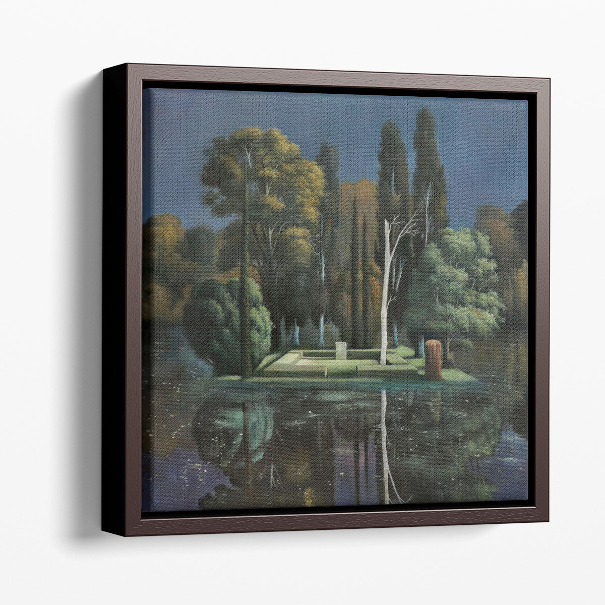 The composition shows a calm water body mirroring tall trees and a monumental tomb-like structure set on an isolated island.