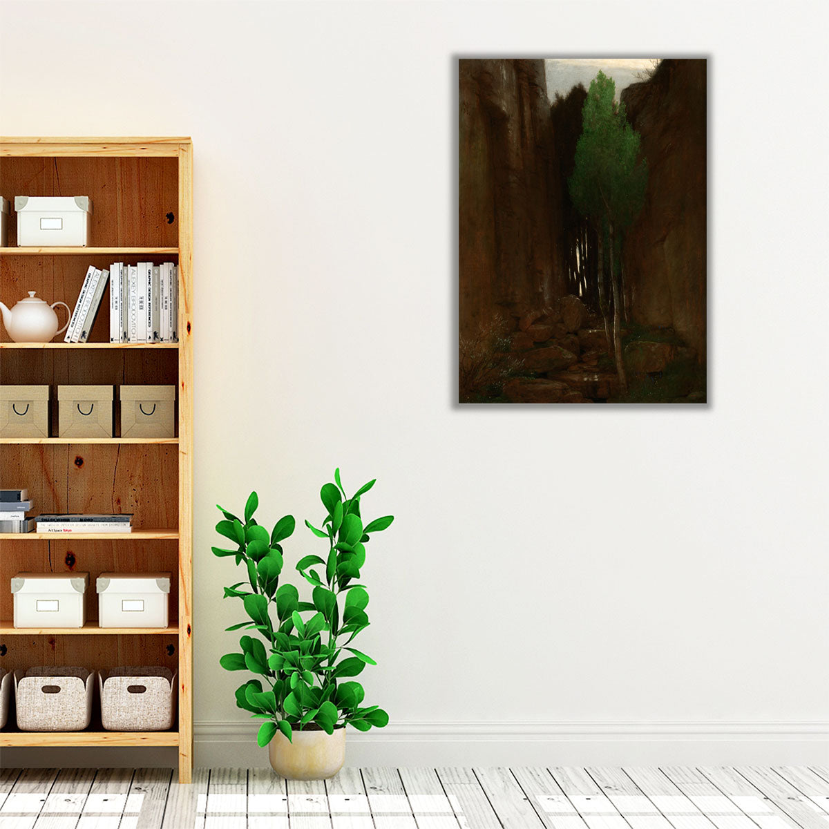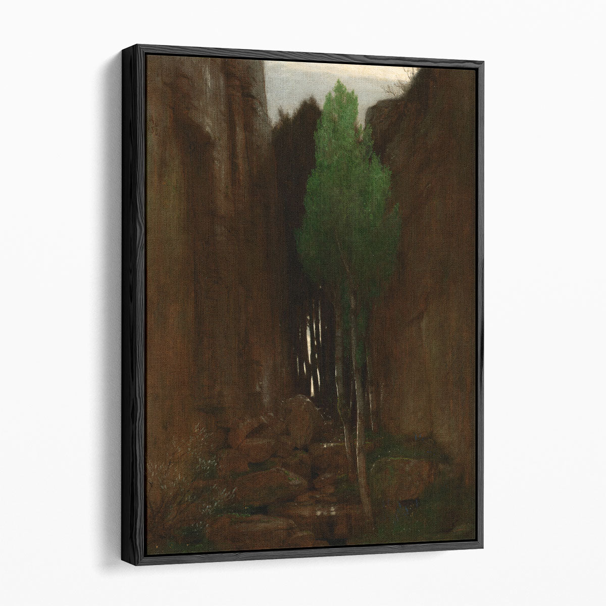 This artwork depicts a lush gorge with a tall cypress, rocky cliffs, and a stream flowing at its base, blending earthy tones with serene natural beauty.