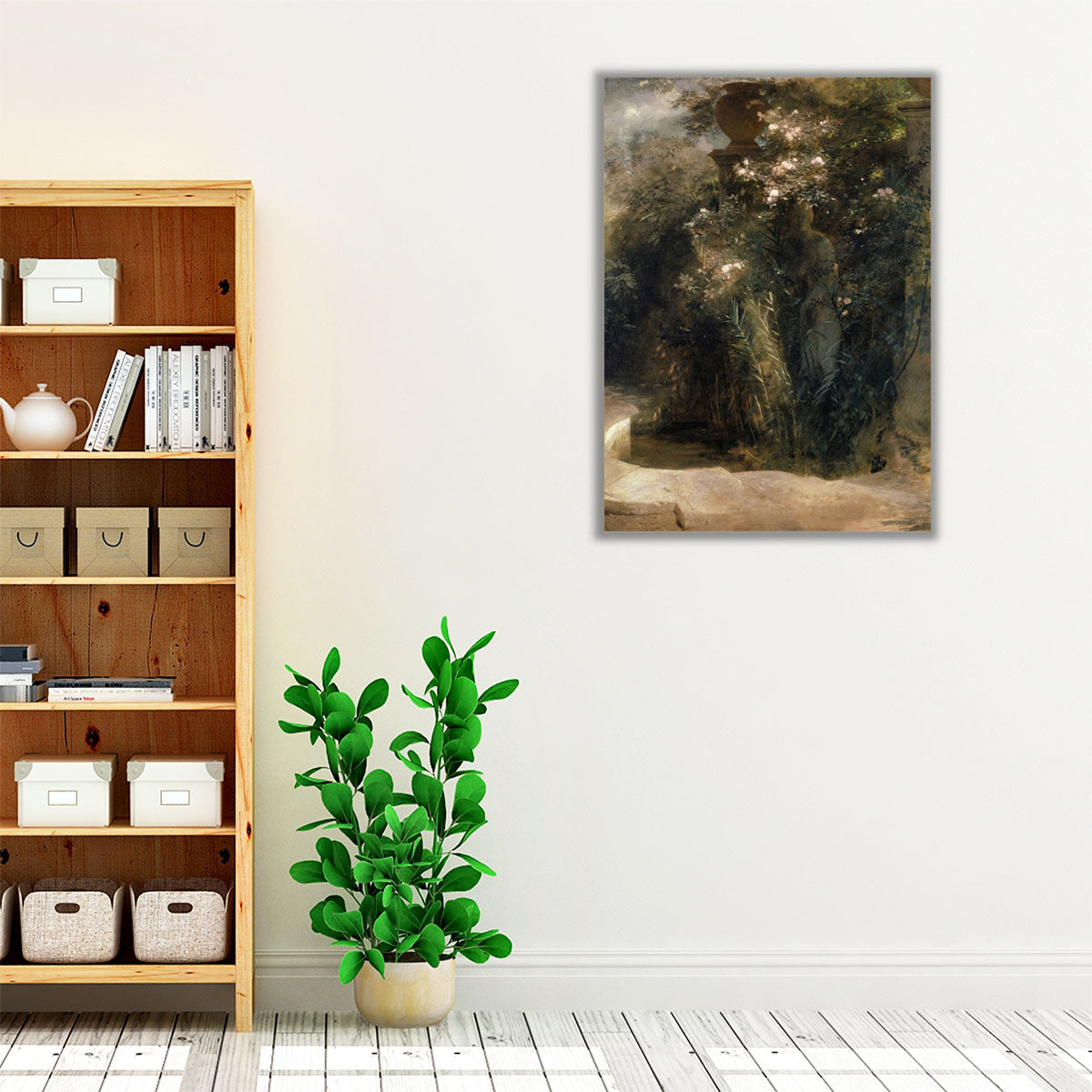 This romantic scene depicts a statue among lush foliage, flowering plants, and a serene pool in neutral and green hues, blending classical beauty with a sense of quiet solitude.