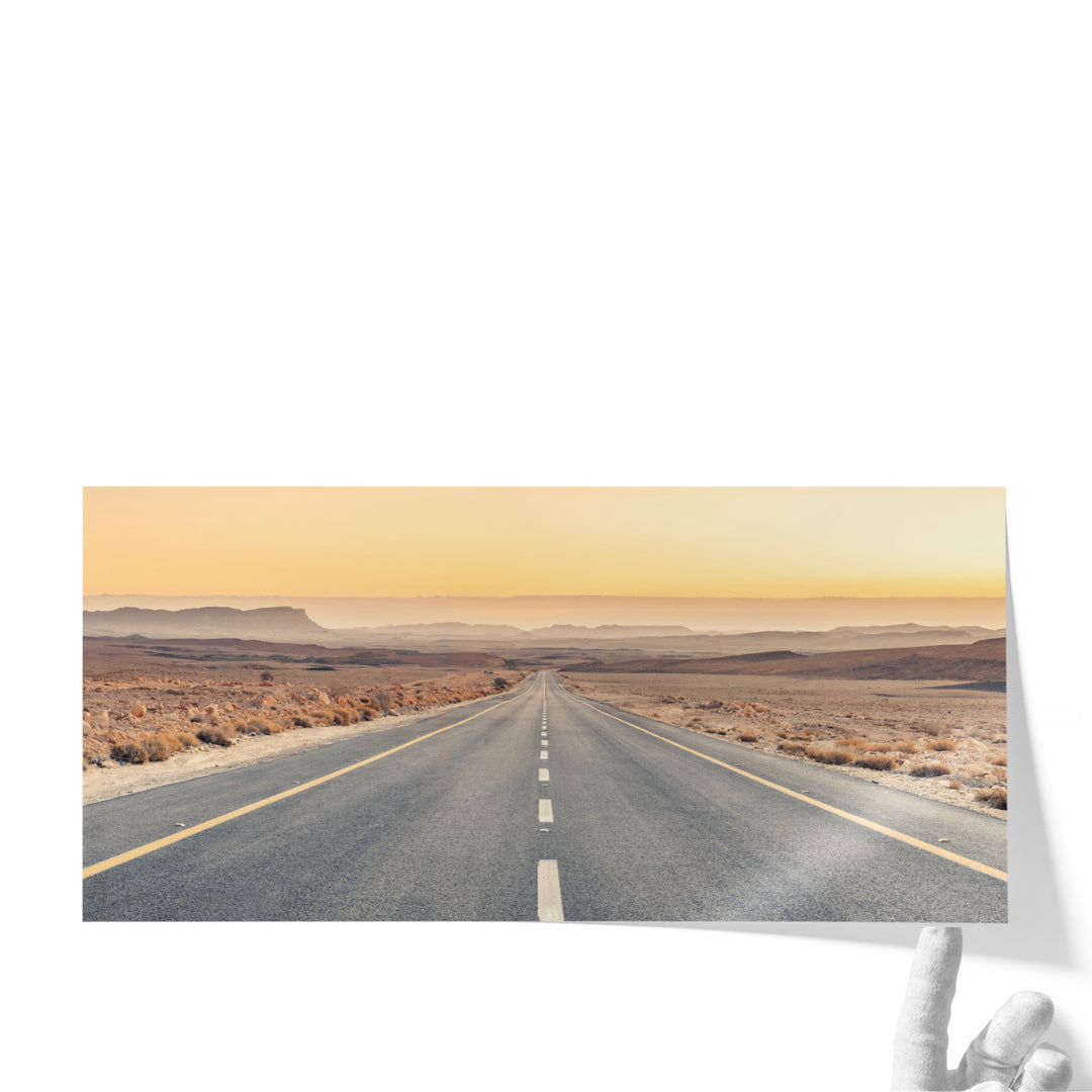 This desert print features a vast, tranquil desert landscape with a glowing sunrise casting soft light on the winding road ahead. The landscape photography prints capture the essence of the open road, surrounded by warm brown and yellow hues. Perfect as yellow sunrise wall art for hallway spaces, this piece adds depth and natural beauty to any home.