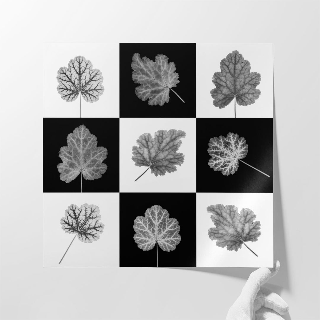 This black and white artwork beautifully captures the intricate details of Heuchera leaves, creating a striking contrast that enhances any modern space.