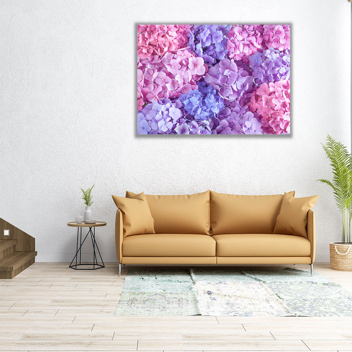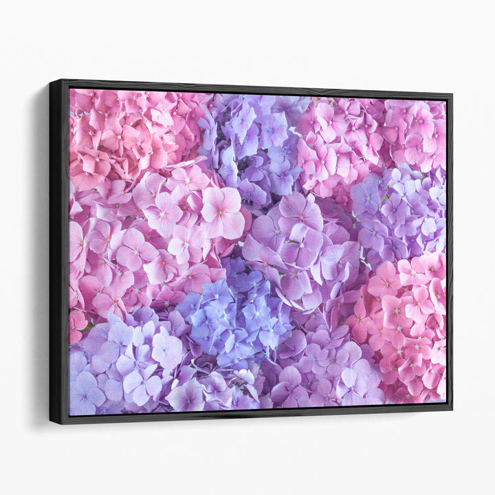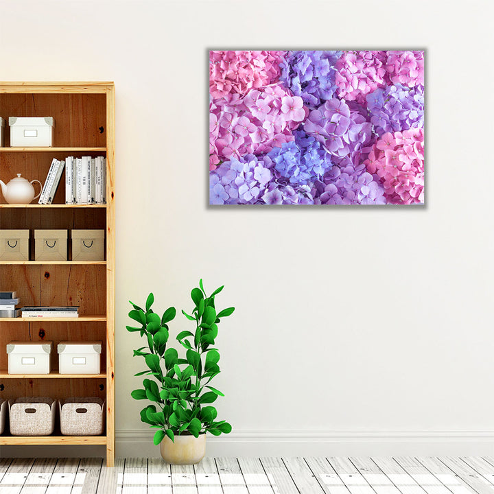 This floral artwork showcases delicate pink hydrangea blossoms, capturing their soft texture and natural beauty in a timeless composition.