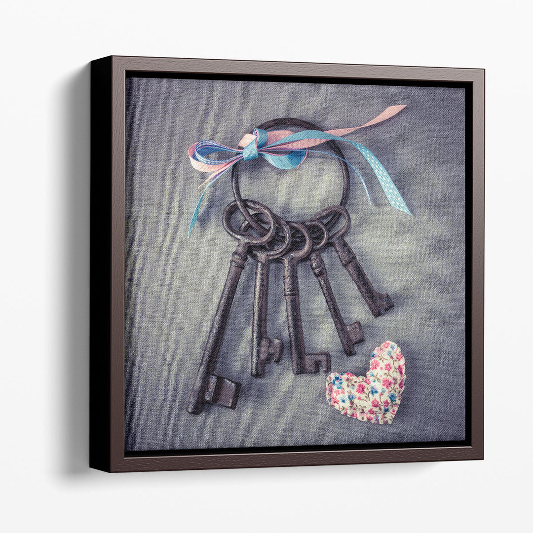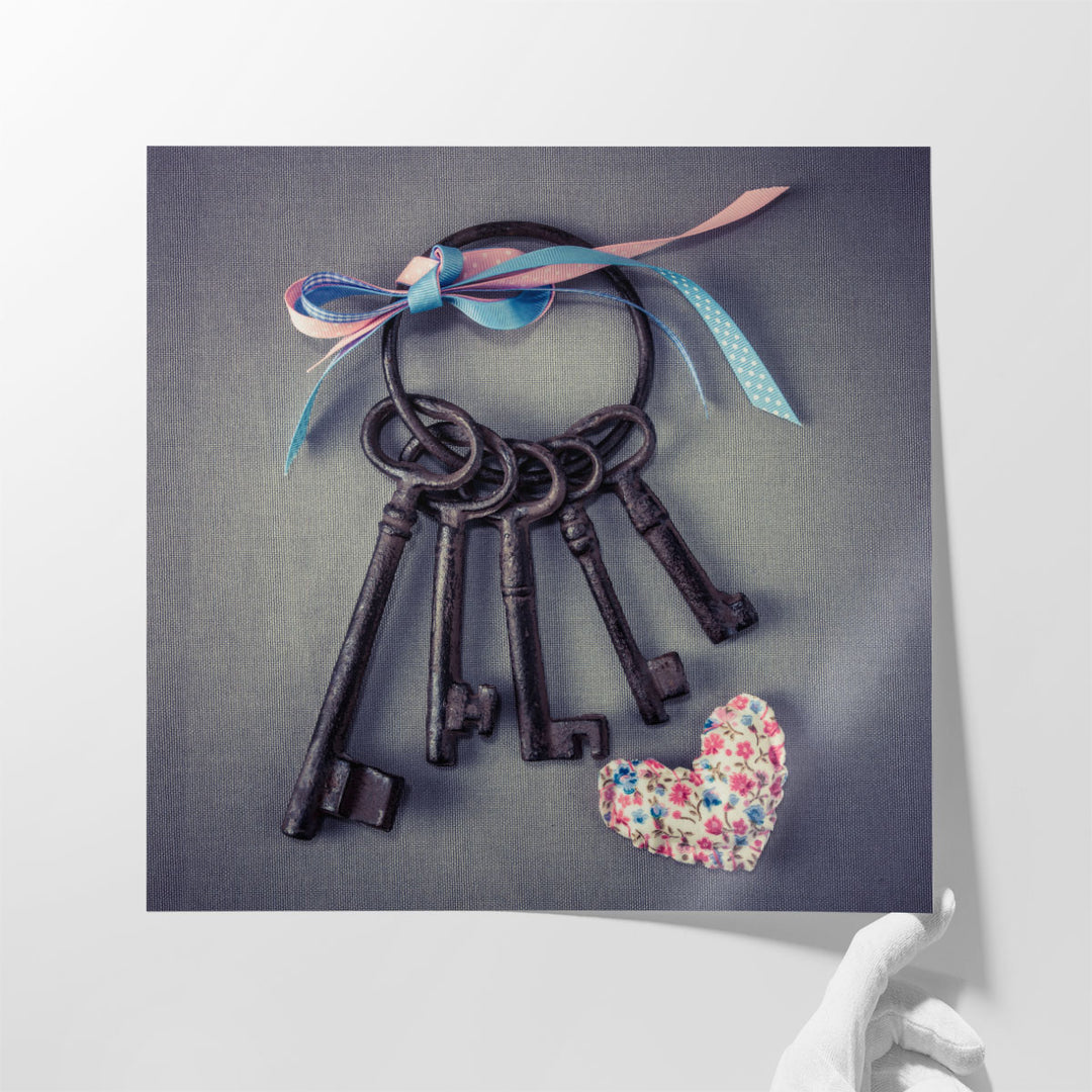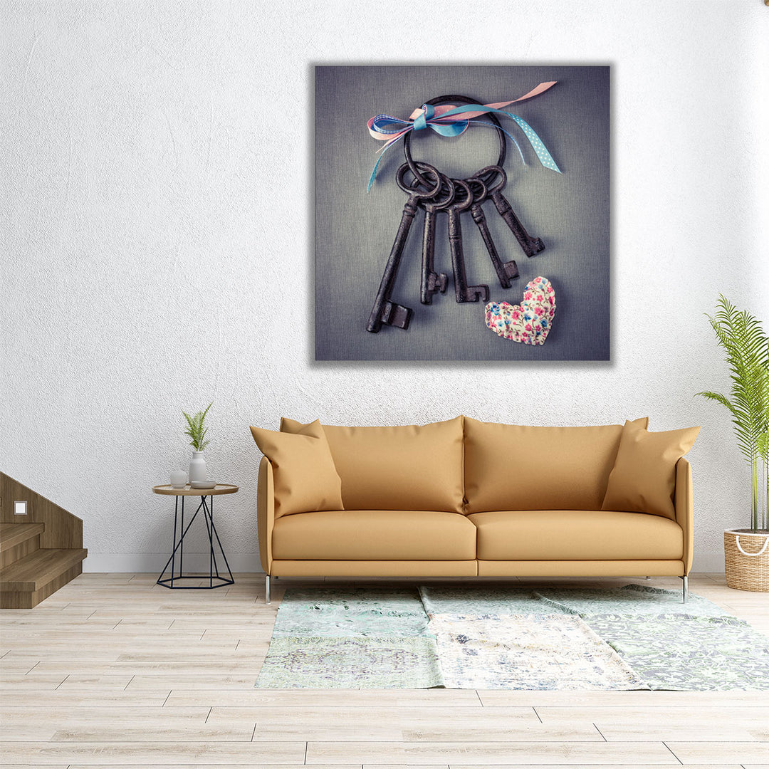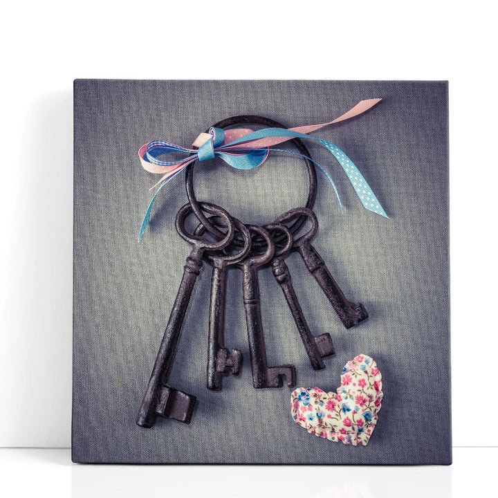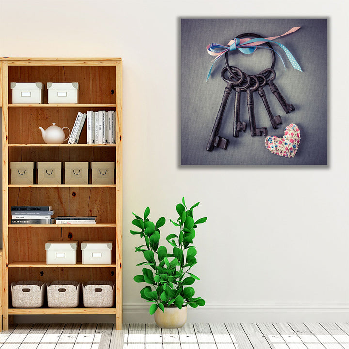 Old Keys with Ribbons and a Heart - Canvas Print Wall Art