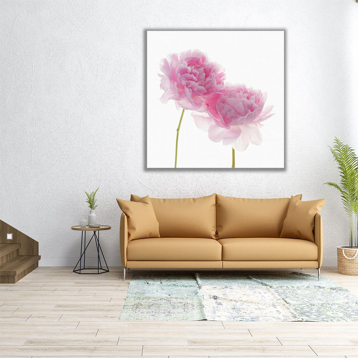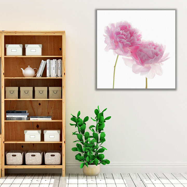This artwork showcases delicate pink peonies set against a pristine white background, creating a soft and elegant floral composition.