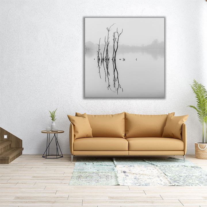 This stunning black and white artwork captures the serene beauty of nature with intricate twig reflections in a calm lake.