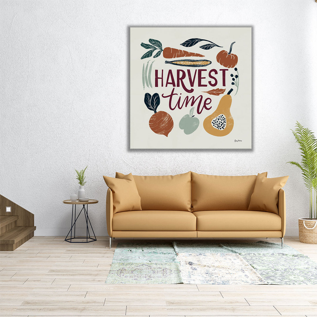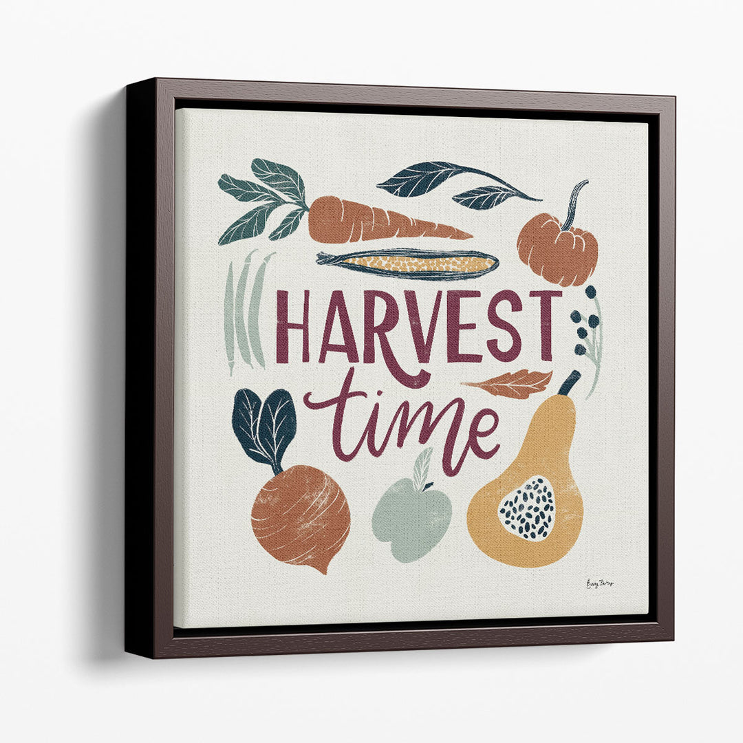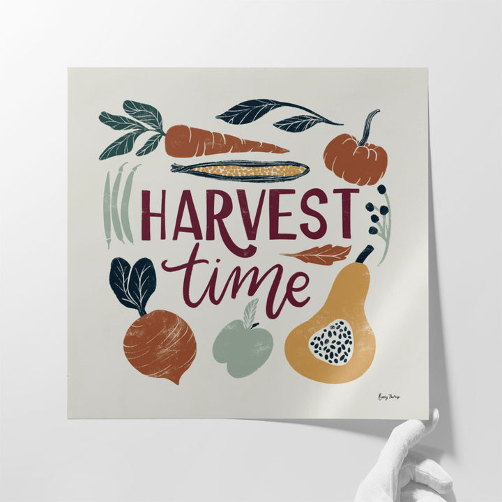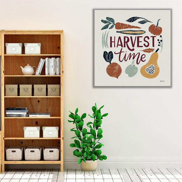 This beautiful canvas art print features harvest time text, surrounded by vibrant vegetables and fruits, capturing the essence of the season.