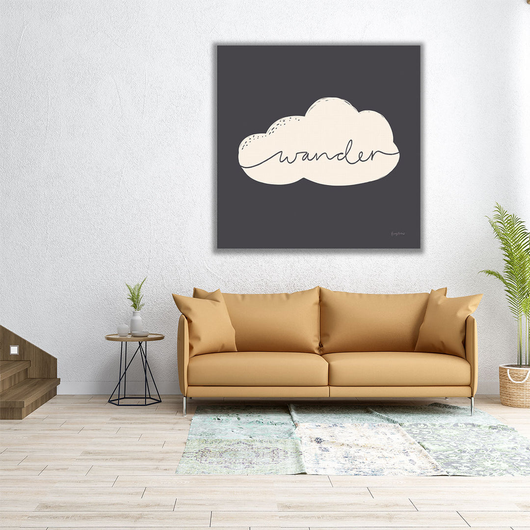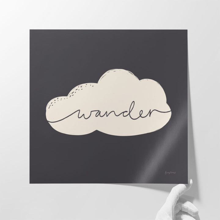 This serene design features the word "wander" elegantly written inside a soft white cloud, bringing a sense of calm and inspiration.