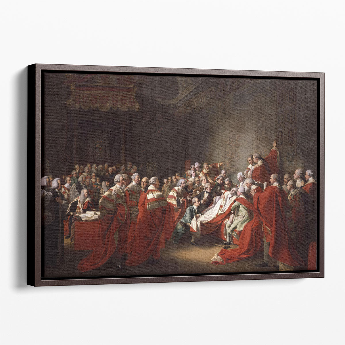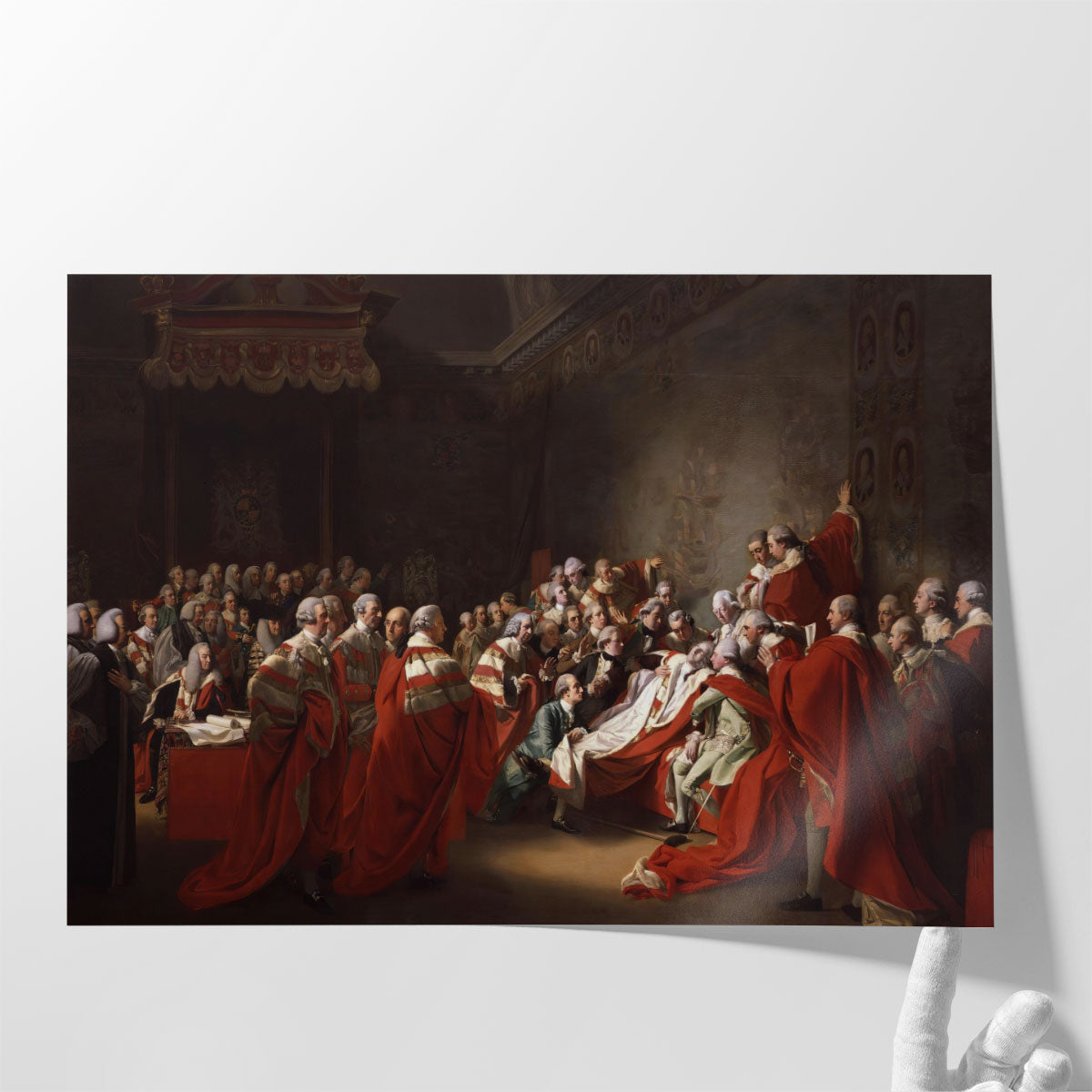 A classic composition of people gathered at a funeral, rendered in neutral tones with black and red details, perfect for adding depth to a living room.