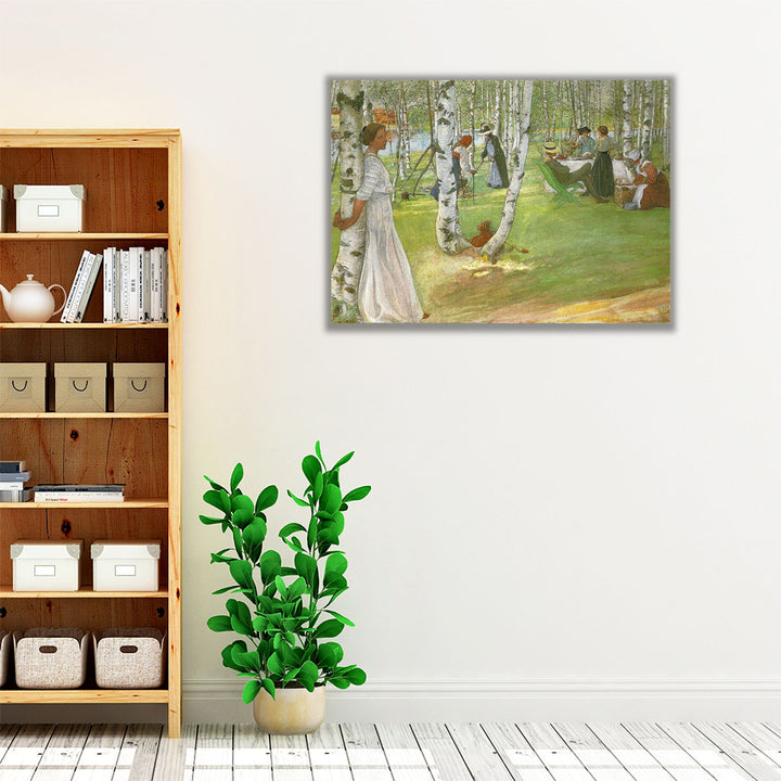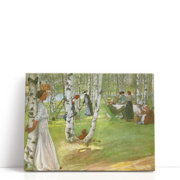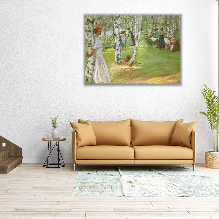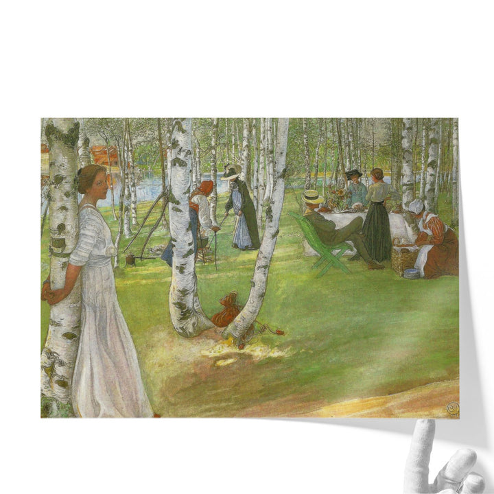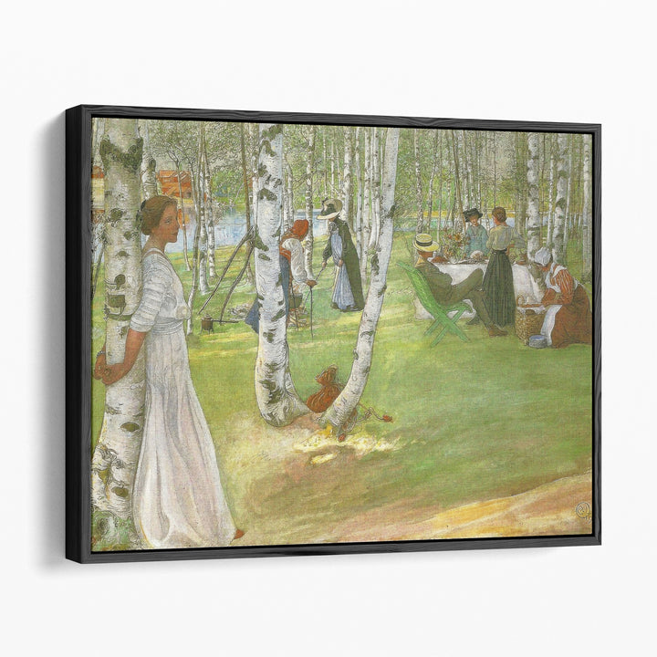 A graceful lady dining outdoors amid green trees and white blooms, with floral and botanical motifs woven into a calm, airy composition.