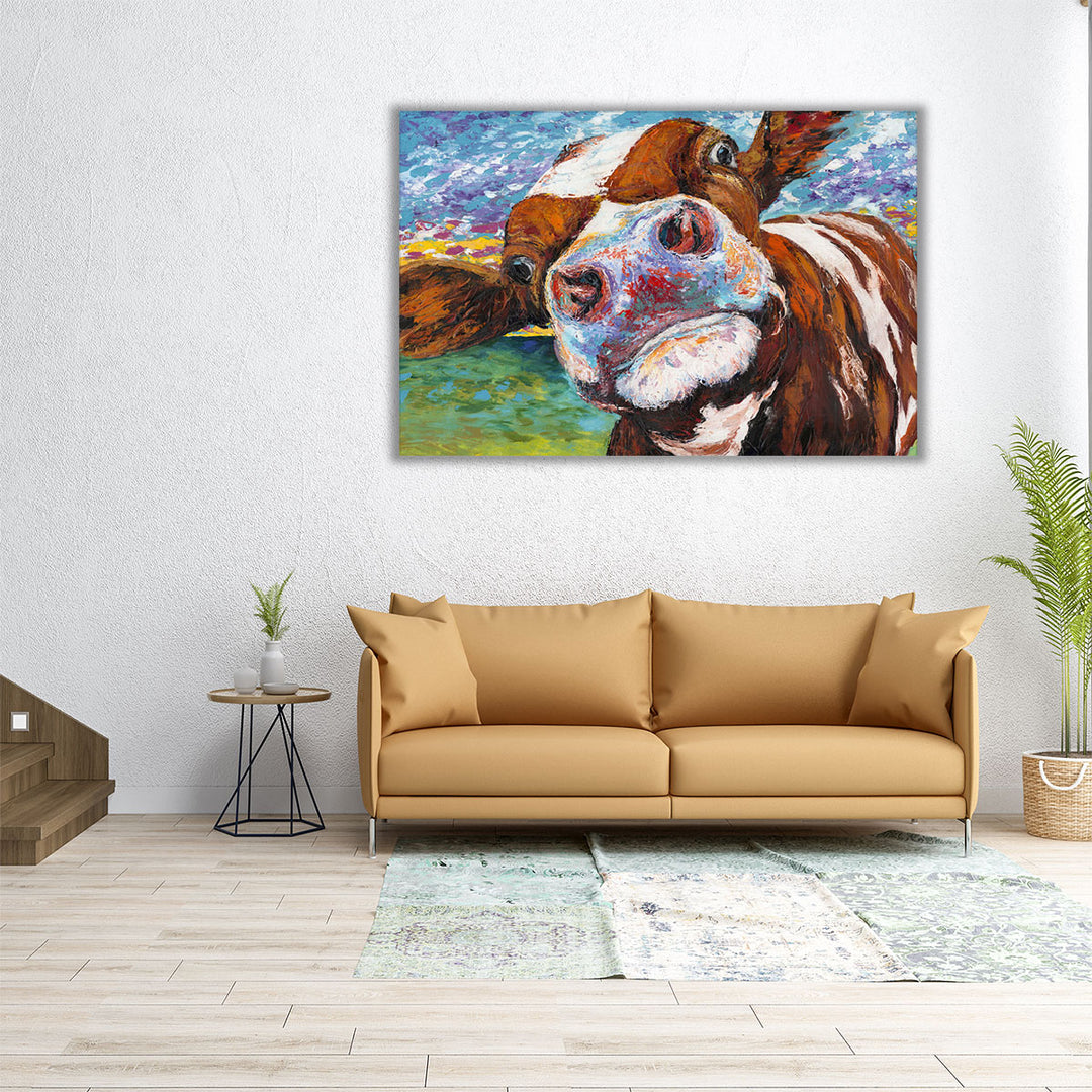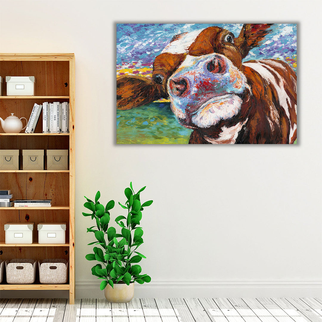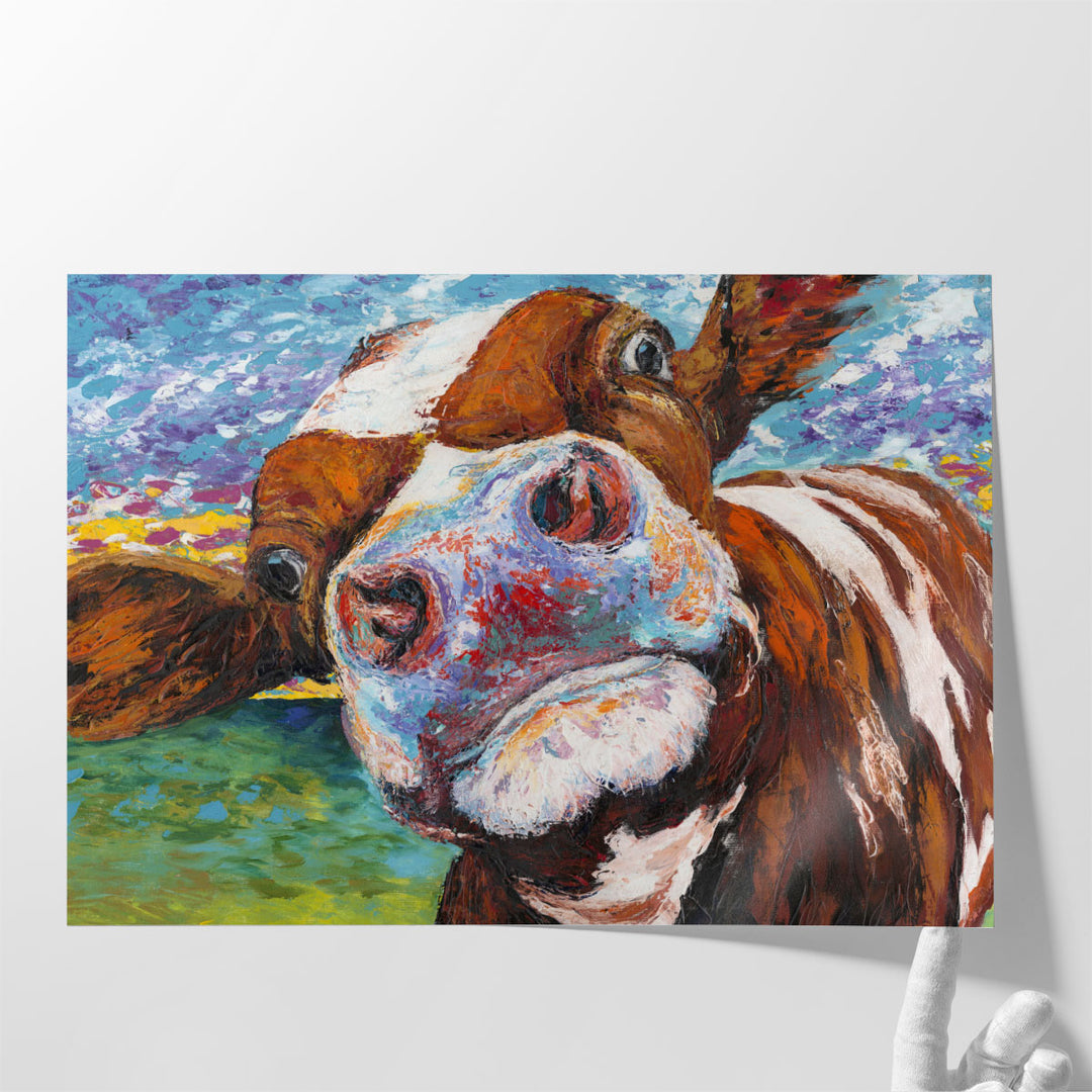 This piece features a close-up of a cow, capturing its curious expression in an engaging and rustic style.