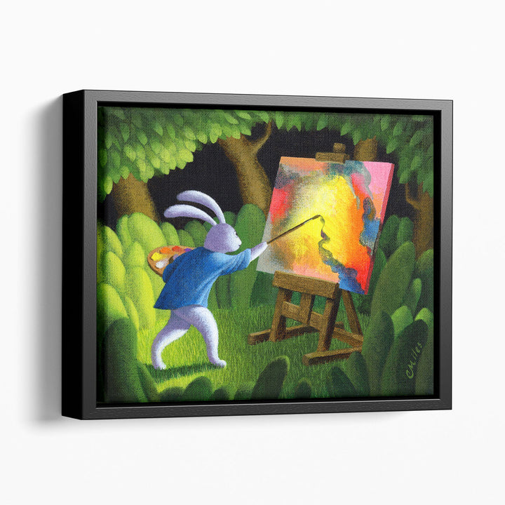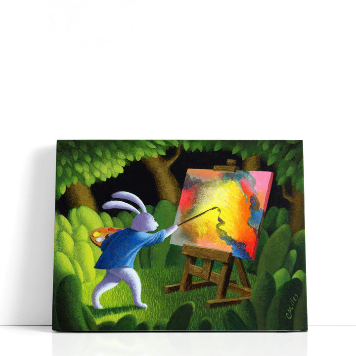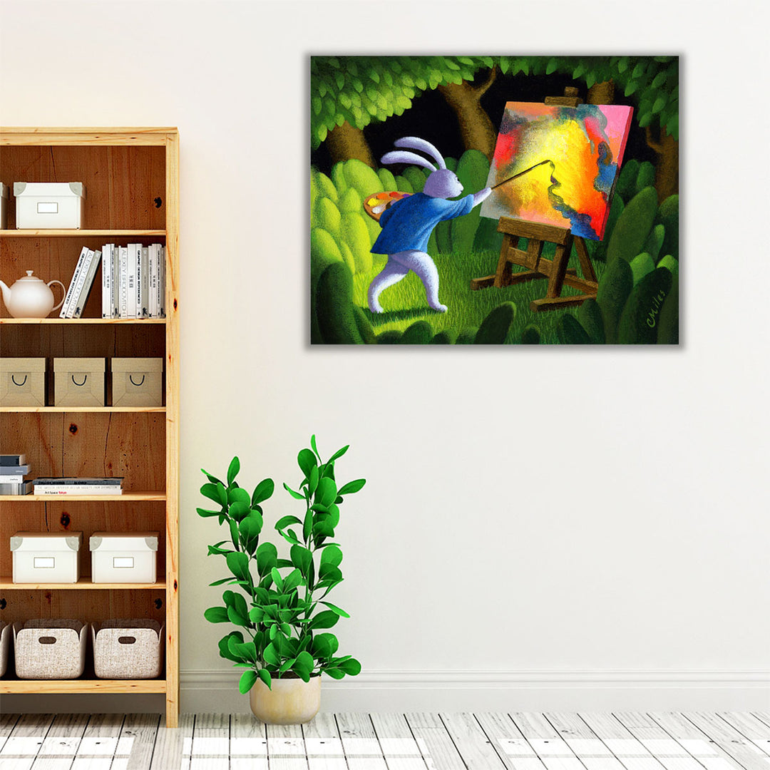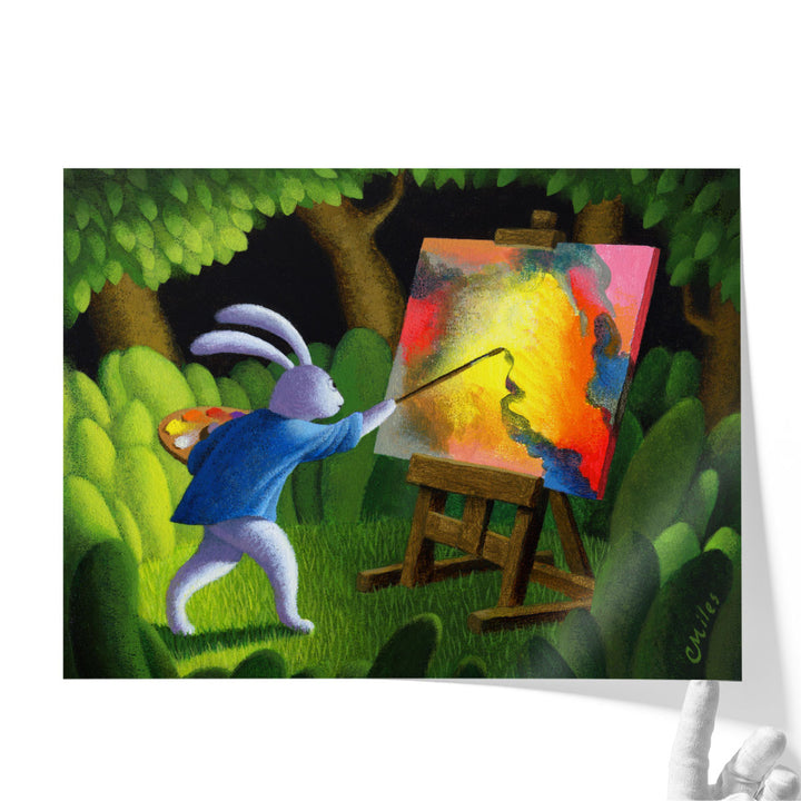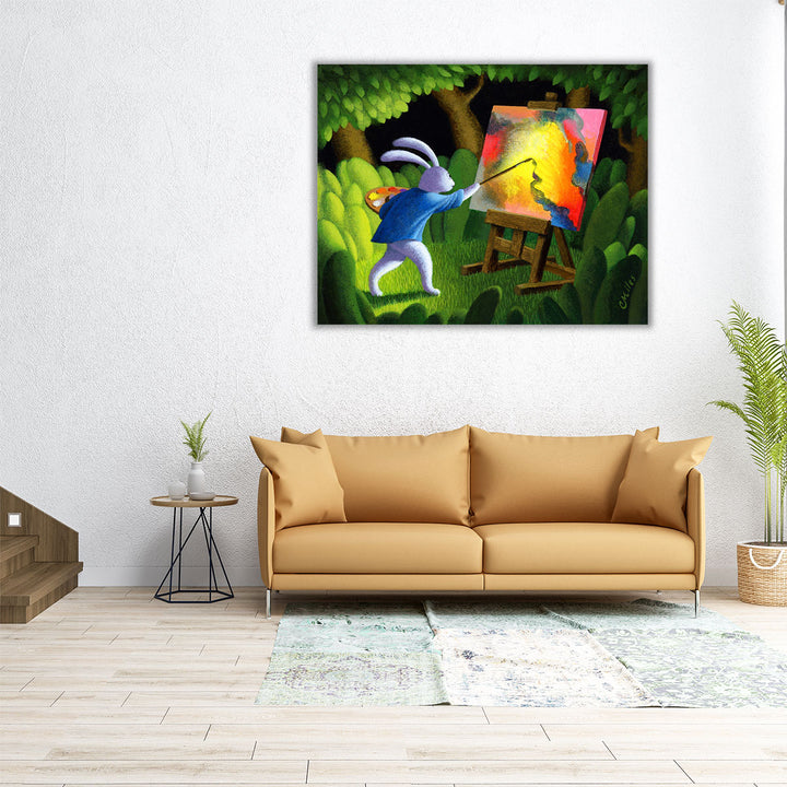 A humorous art scene featuring a rabbit painting on a canvas, surrounded by lush green plants and vibrant colors.