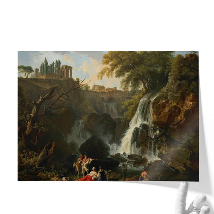 This classical landscape captures a grand waterfall beside ancient Roman ruins, with figures admiring the scene in an 18th-century romantic style.