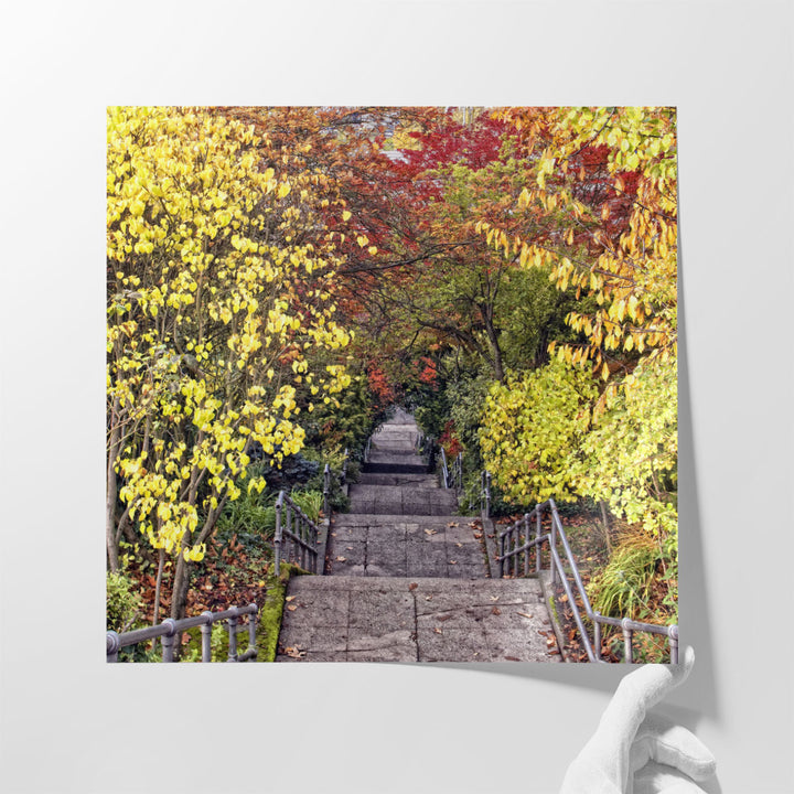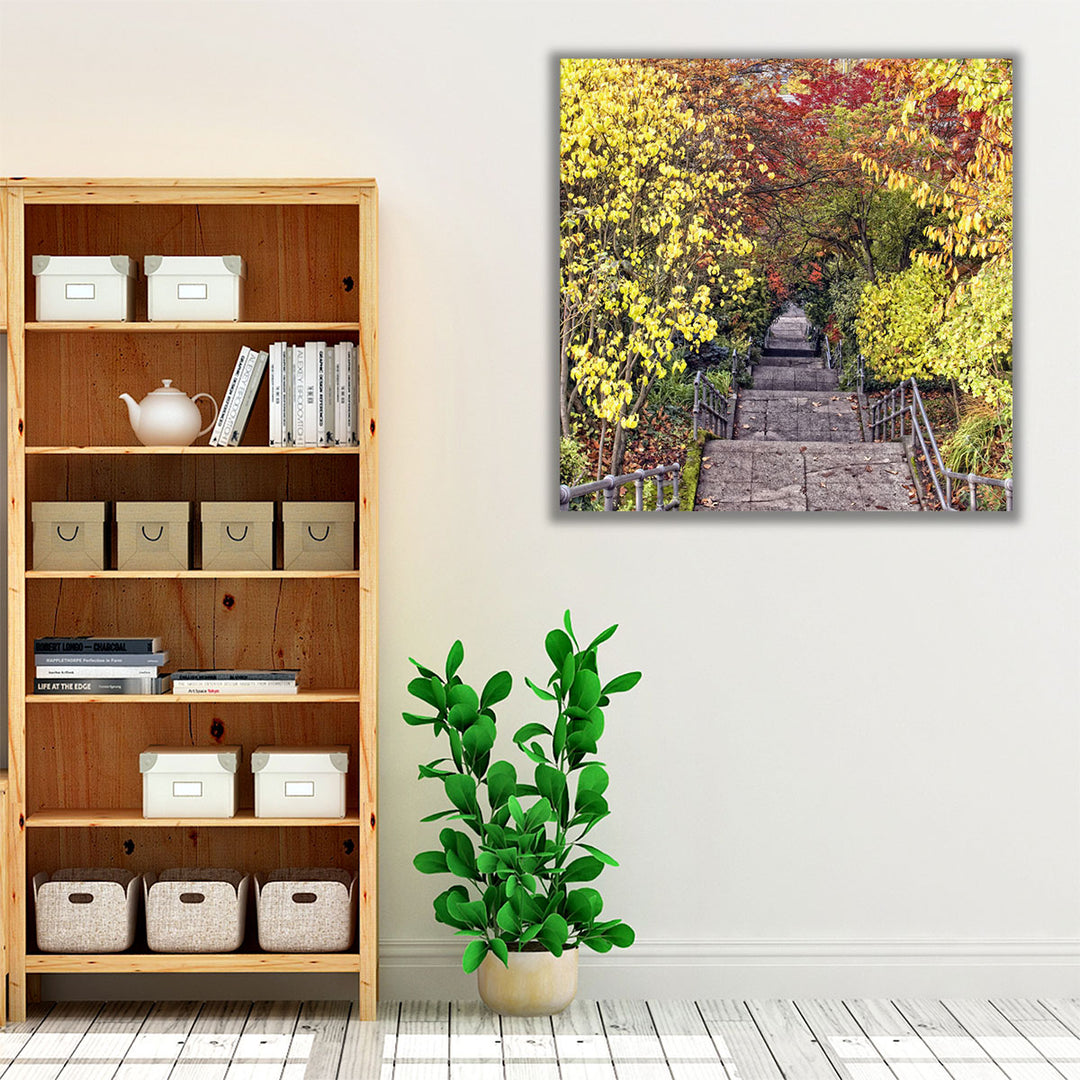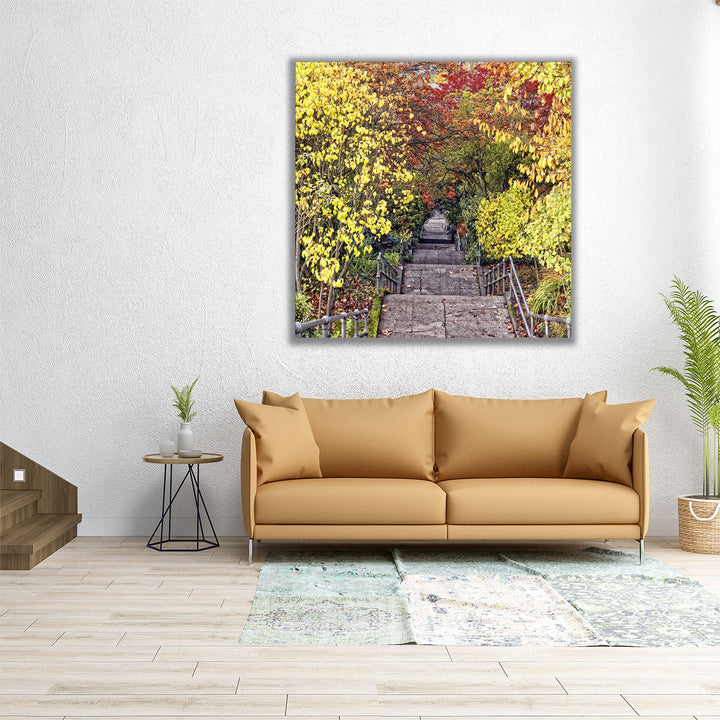 This captivating piece features a serene staircase framed by trees in vibrant autumn hues, evoking the warm and nostalgic essence of fall.