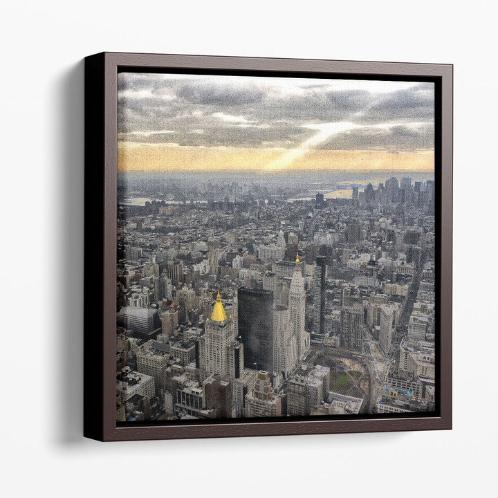 This stunning cityscape captures golden-capped buildings under a dramatic sunset, blending architectural elegance with nature’s vibrant hues.