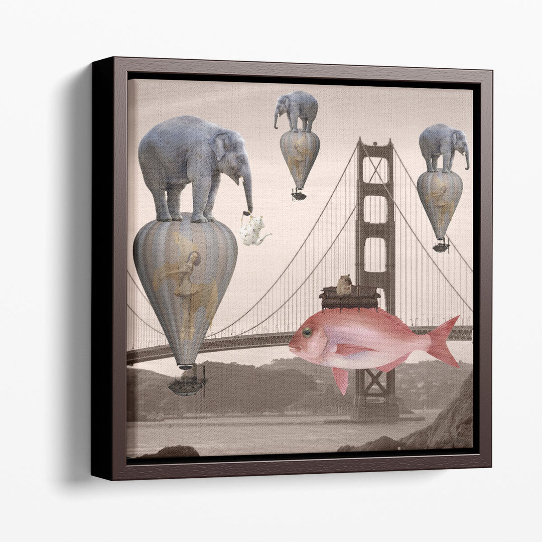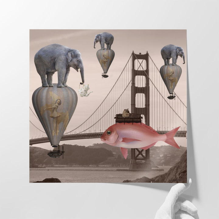 Surreal elephants balanced on hot air balloons drift above bridges and fish in this neutral-toned, gray surrealism piece.