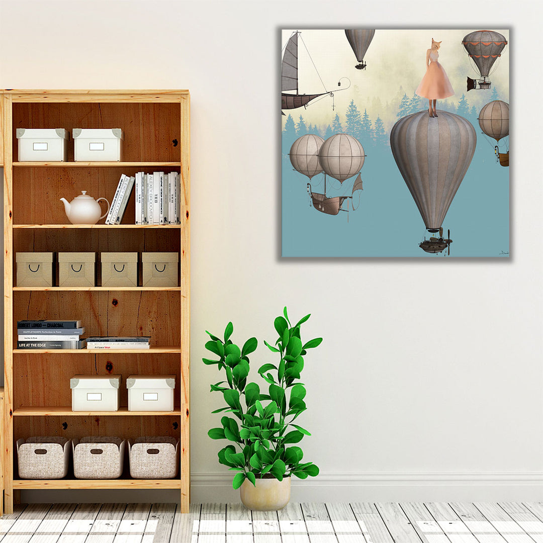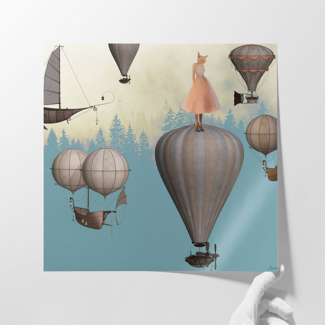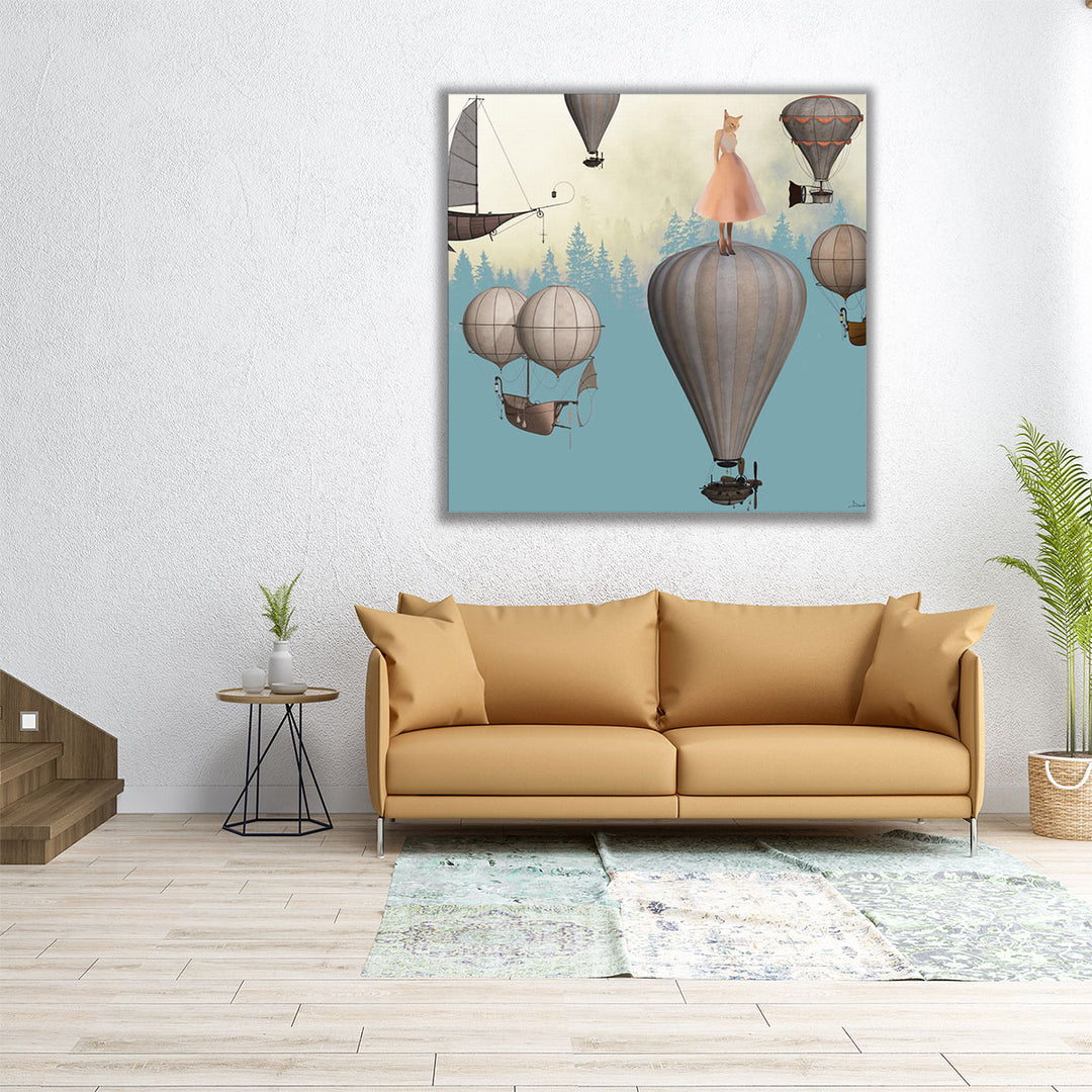 A whimsical cat in a dress balances atop a hot air balloon, painted in calming blue, gray, and neutral tones with a dreamy artistic flair.