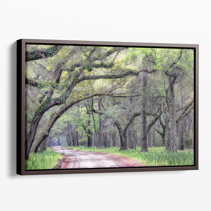 Nature-inspired beauty with a floral touch showcases green trees along a serene path, blending shades of green and gray for a tranquil appeal.