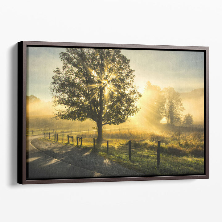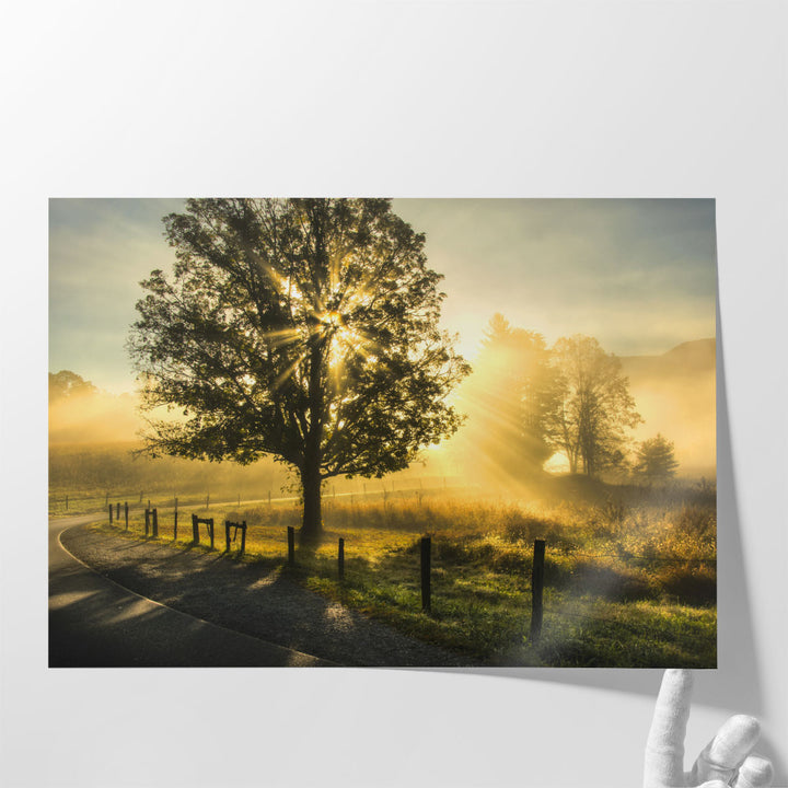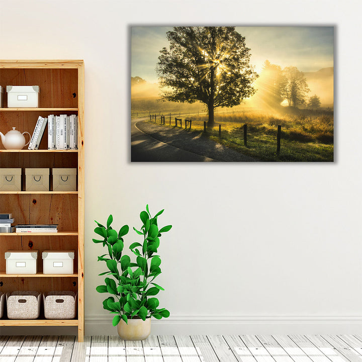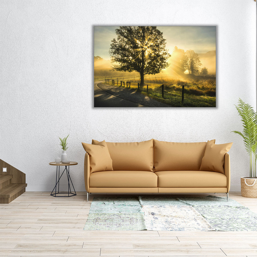 A serene nature-inspired piece capturing a scenic sunrise with vibrant yellow and green tones, showcasing a majestic tree as the focal point.
