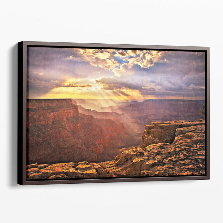 This artwork captures a breathtaking sunset over a canyon, blending serene hues with natural beauty to create a mesmerizing visual experience.