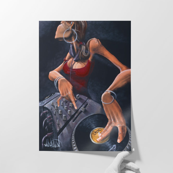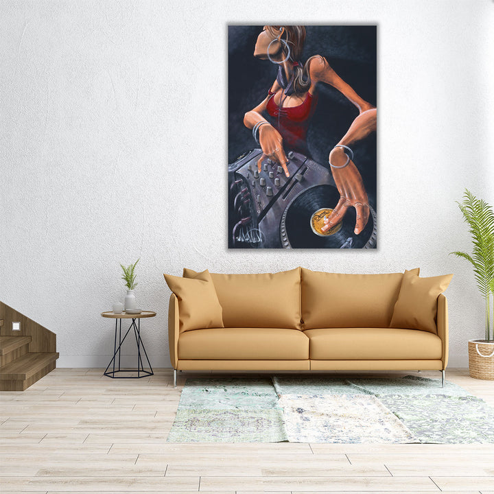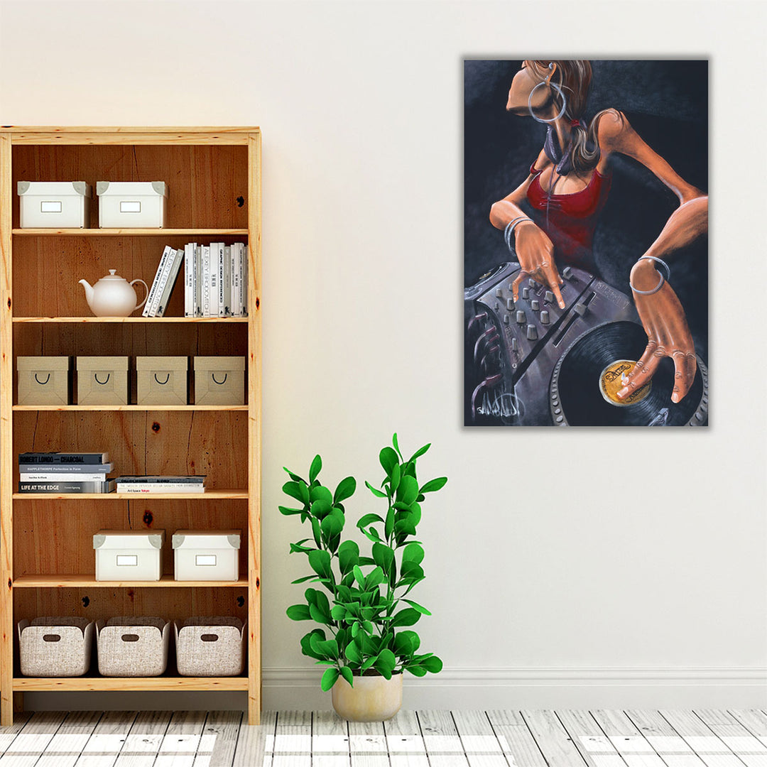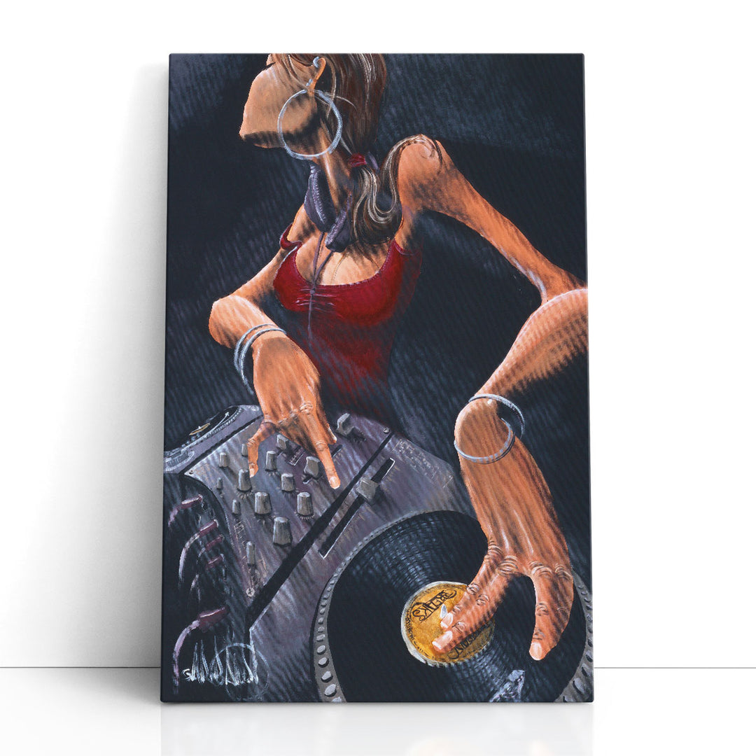 This bold piece captures a stylish DJ girl with her equipment, adorned in dazzling jewelry, in a vibrant urban art style.