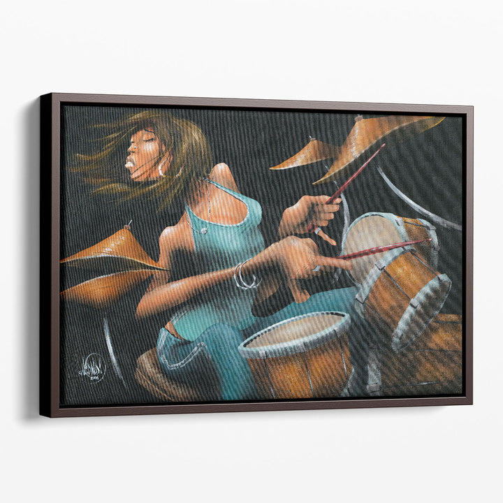 This expressive artwork captures a woman passionately playing drums, exuding rhythm and dynamic movement through a bold, energetic style.