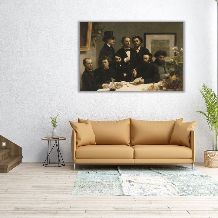 The composition depicts a gathering of gentlemen in black suits seated around a table, emphasizing a refined and formal 19th-century atmosphere.