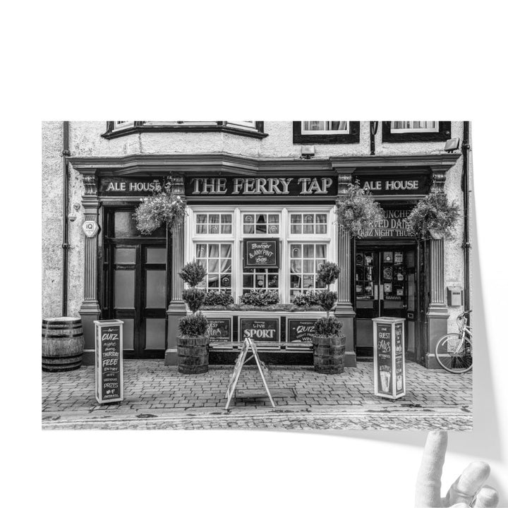 A striking black-and-white photography piece captures the architectural charm of a quaint cafe, exuding a classic and sophisticated allure.