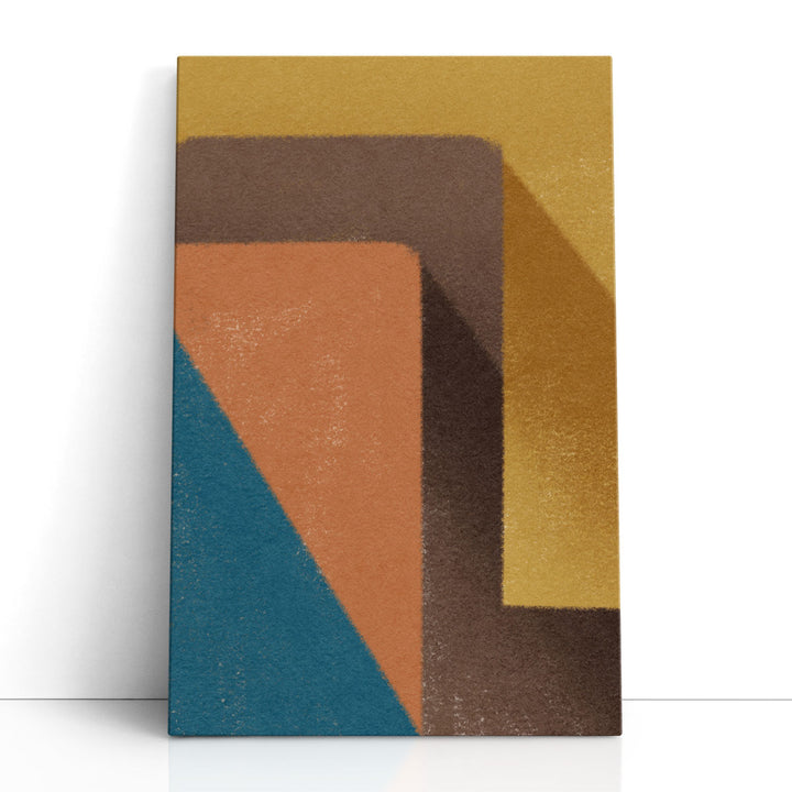 Bold yellow shapes intersect with cool blue triangles and earthy brown triangles, creating a dynamic geometric tapestry. This abstract piece energizes living rooms, hallways, or bedrooms with its modern flair. Printed on high-quality semi gloss paper or wrapped canvas, it offers versatile framing options—espresso, black, or white—to suit any interior palette. Make a statement above your sofa or console with this captivating artwork.