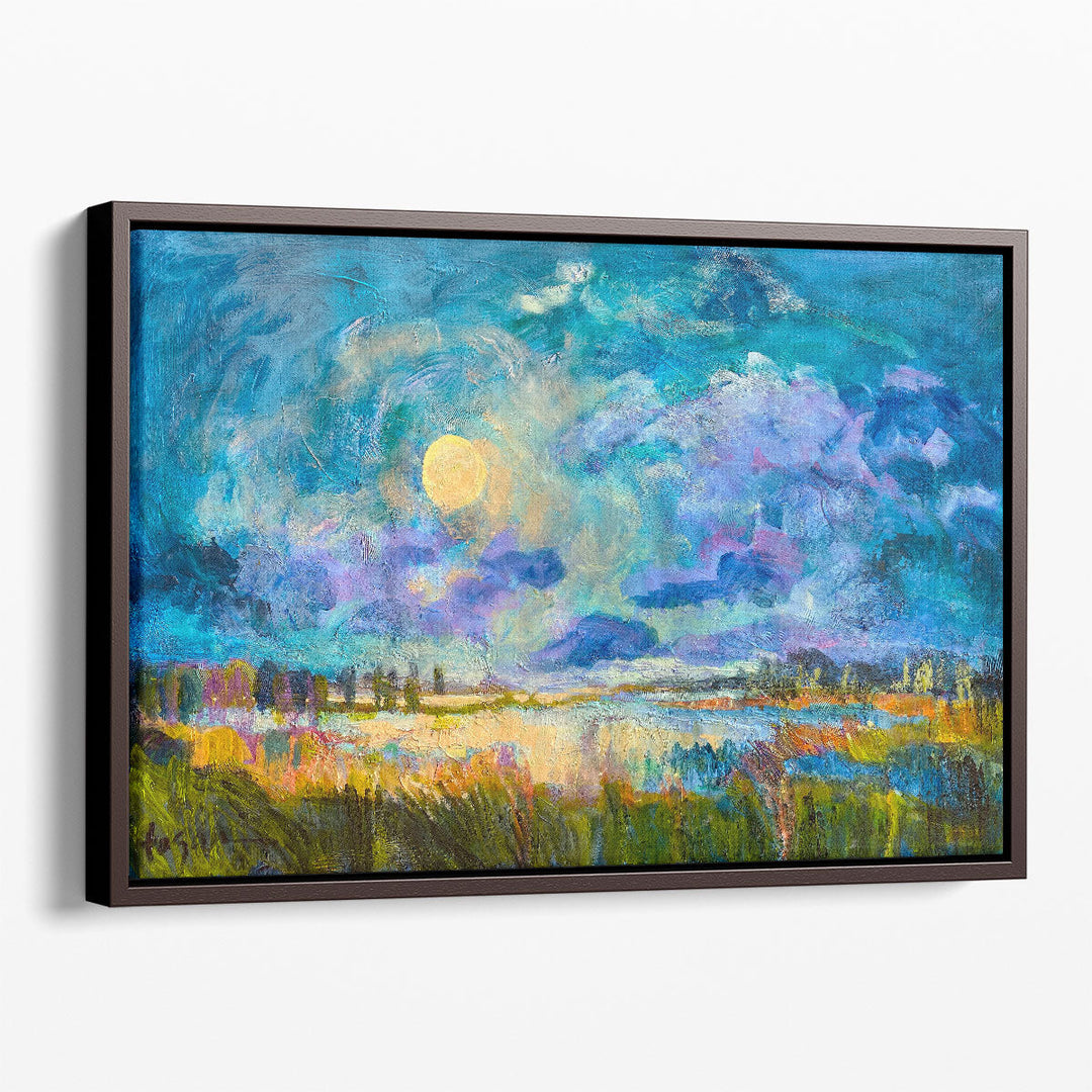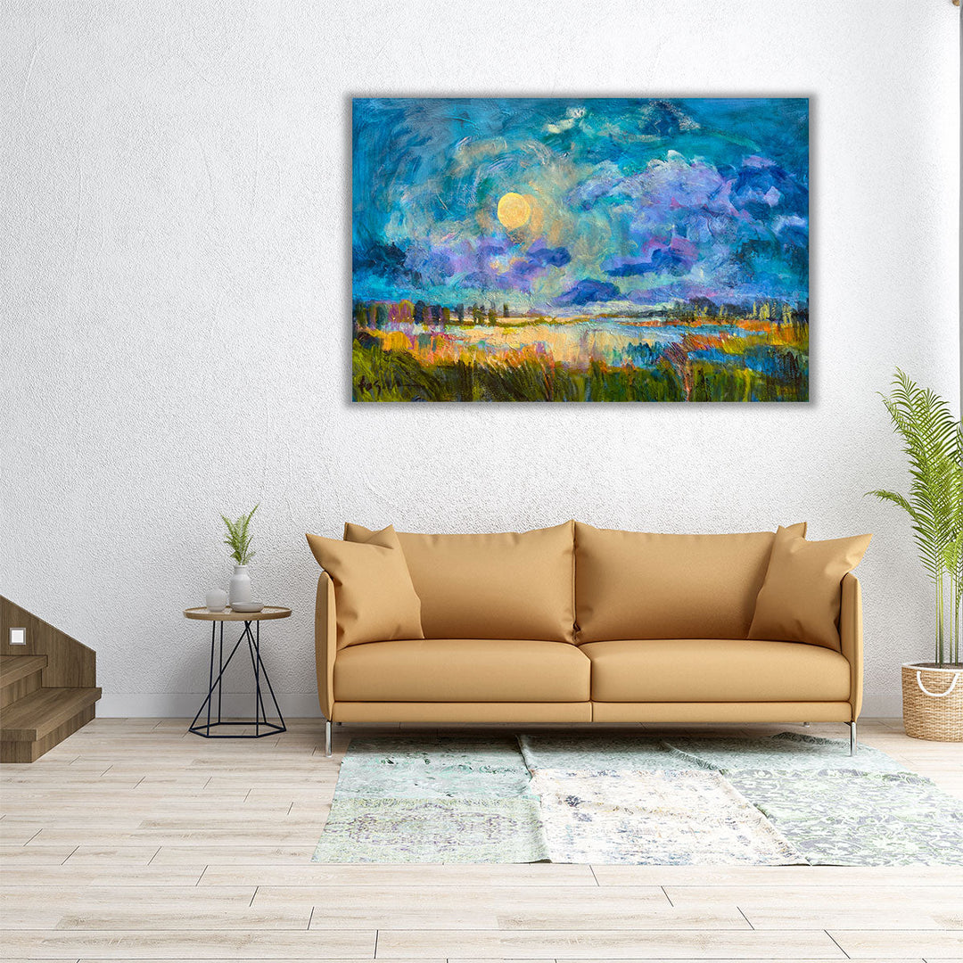Let your hallway glow with this moon canvas painting, where a luminous moon rises over rolling hills bathed in deep blues and touches of green and yellow. The artwork captures a calm, dreamlike mood that’s both vibrant and soothing. Perfect for transitional spaces, this piece merges the charm of abstract landscape canvas art with the refined calm of blue scenic wall art for hallway décor—offering a quiet moment of beauty each time you pass by.