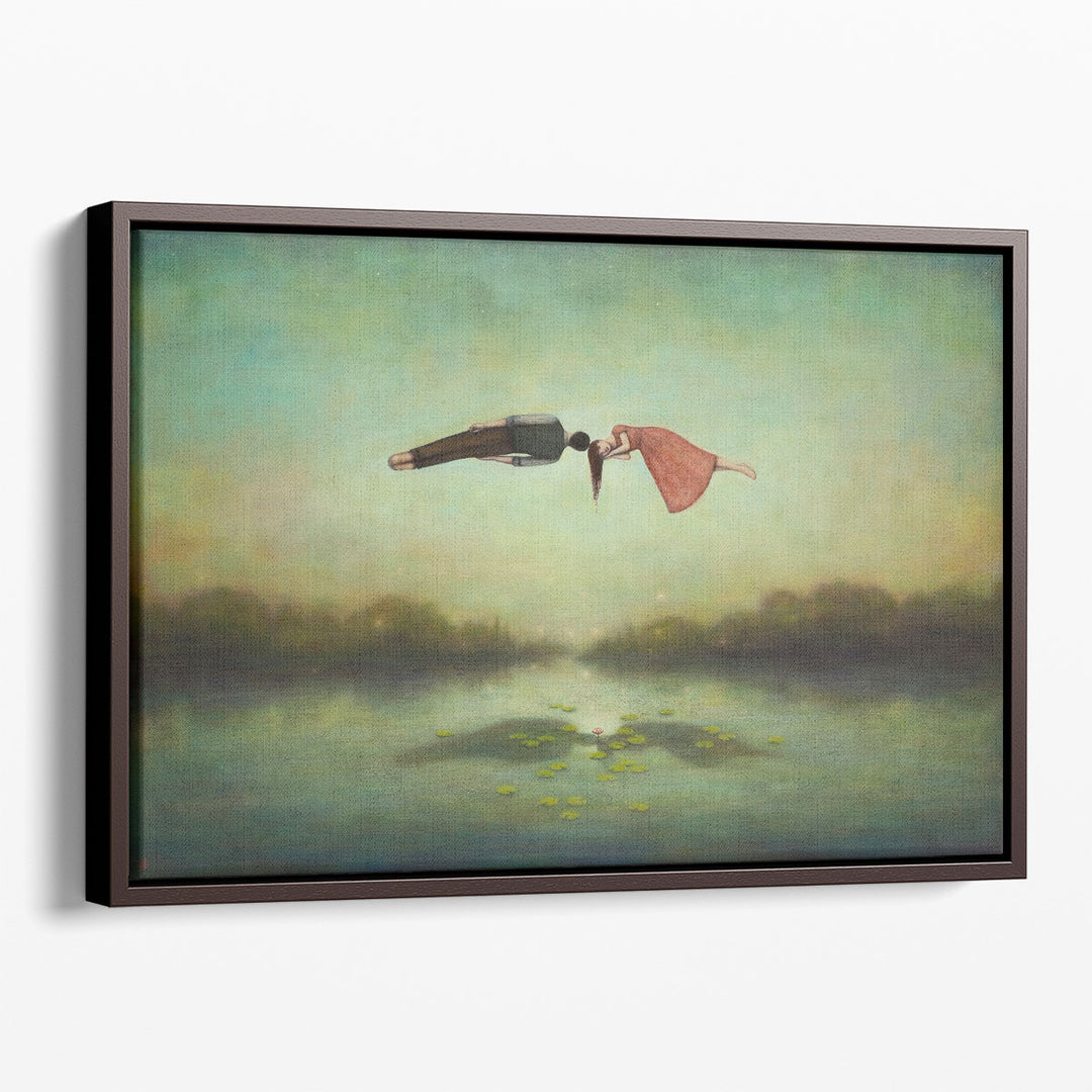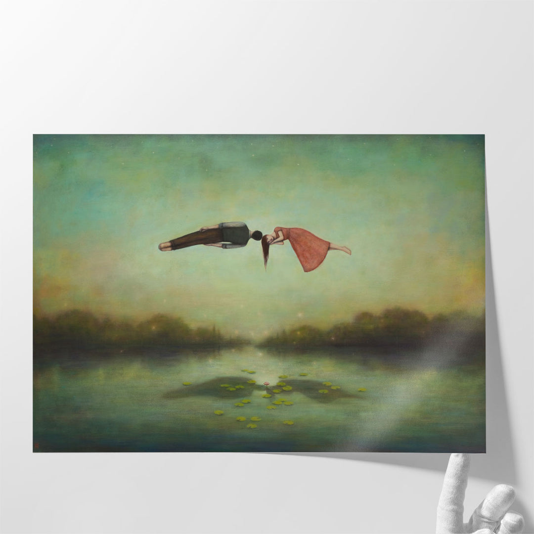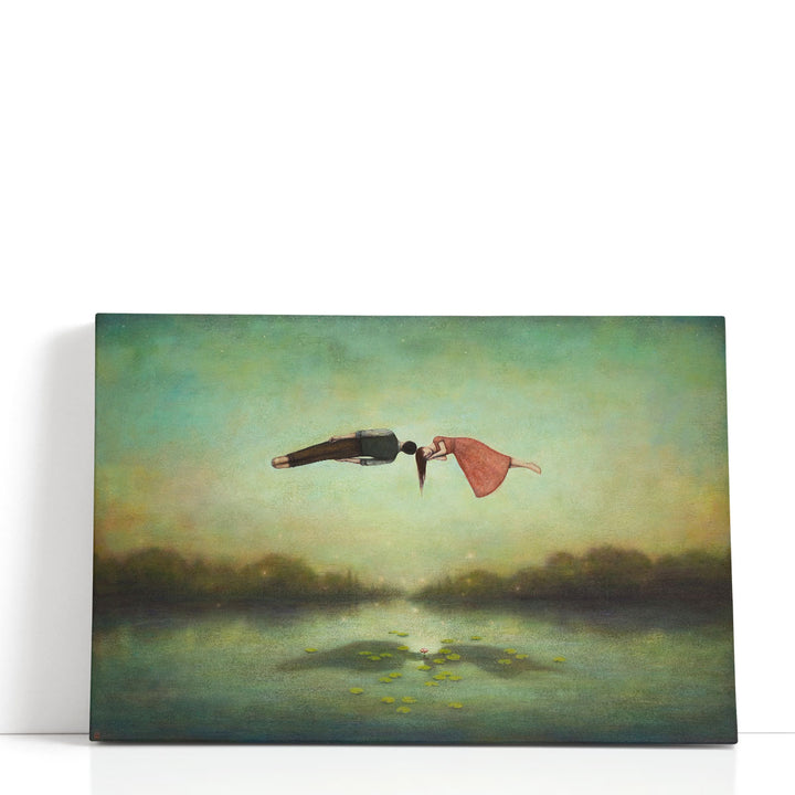 This surreal artwork illustrates a tranquil moment of two figures drifting in harmony above a still, mirror-like lake.