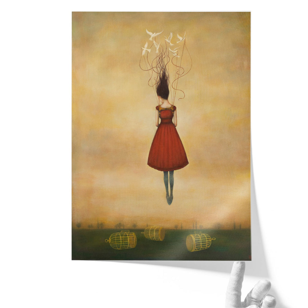 A surreal depiction of a girl in a red dress set against a brown and green backdrop, rendered in a contemporary style by Duy Huynh.