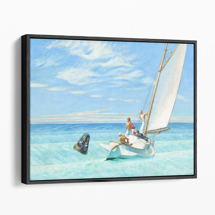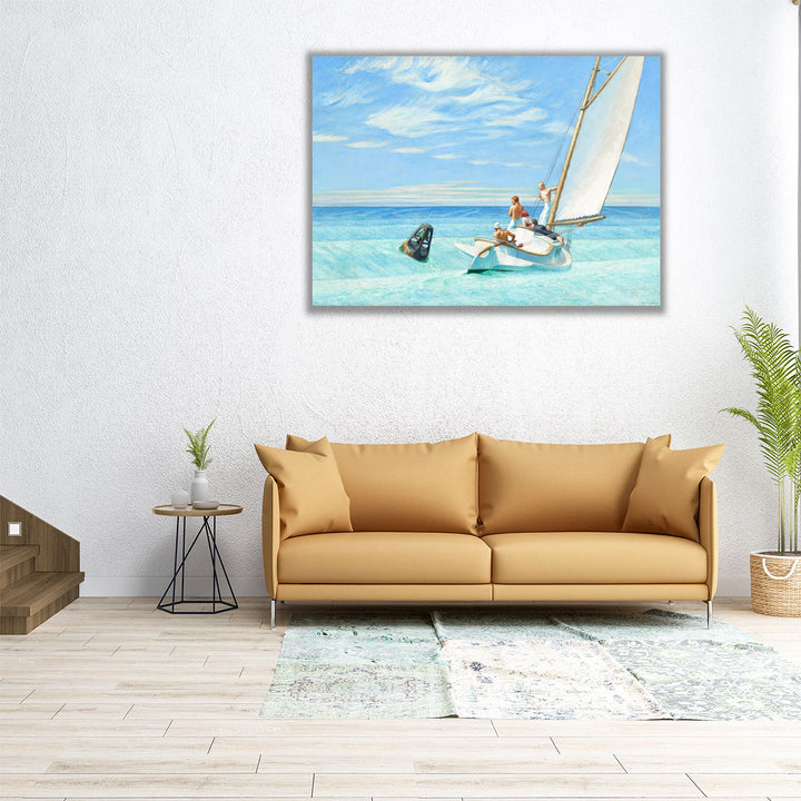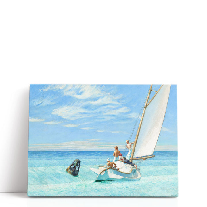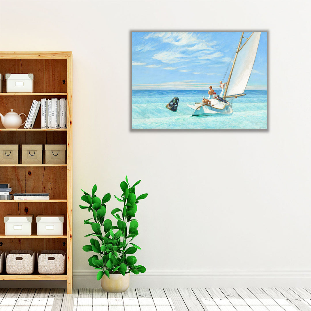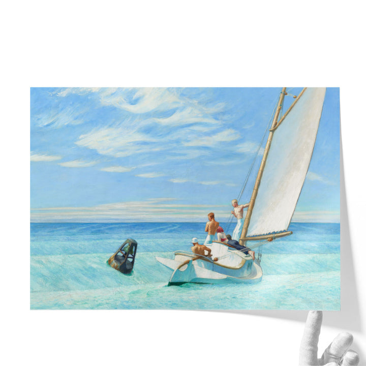This classic ocean scene features a boat with people adrift on calm waters, brought to life with blue and white tones and Hopper's iconic scenic style.