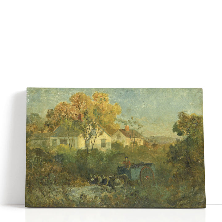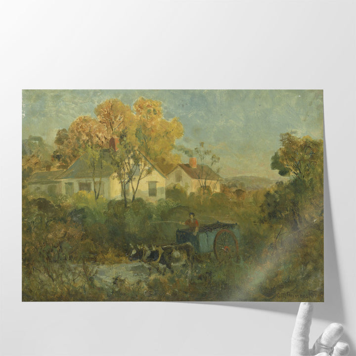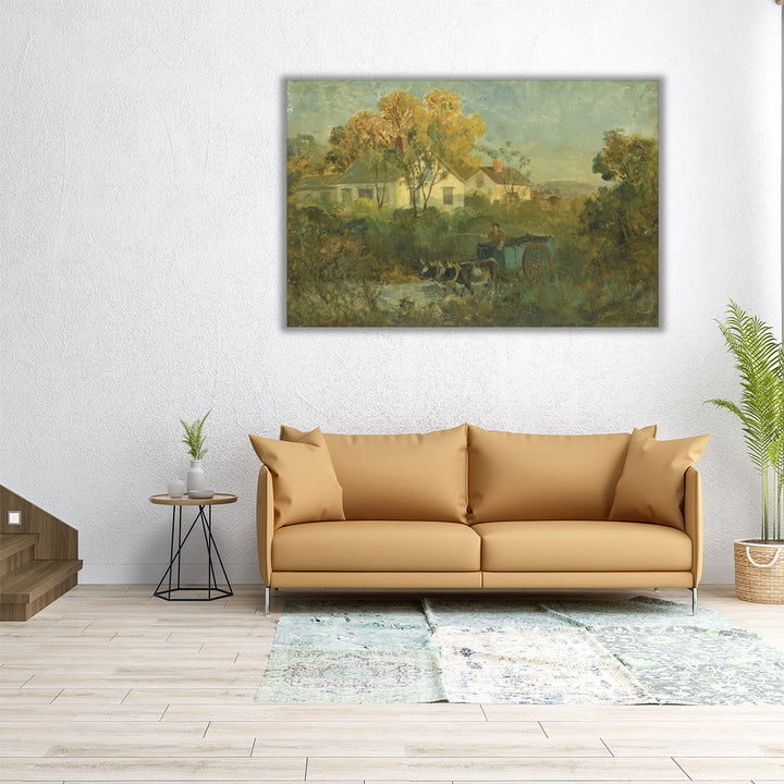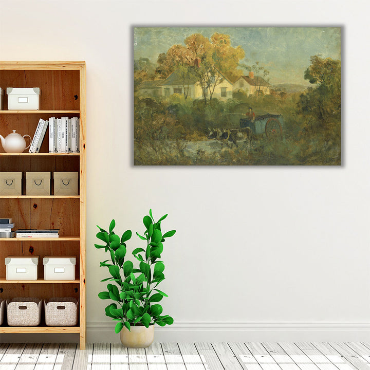 This painting shows a lone figure guiding a bullock cart past lush greenery, trees, and cottages in a detailed and rustic pastoral style.