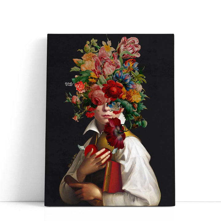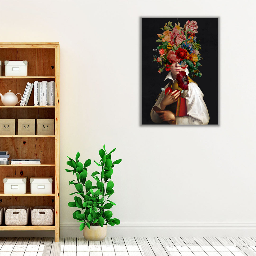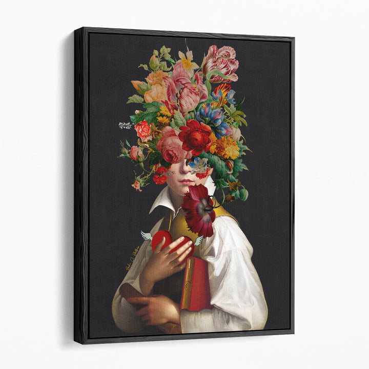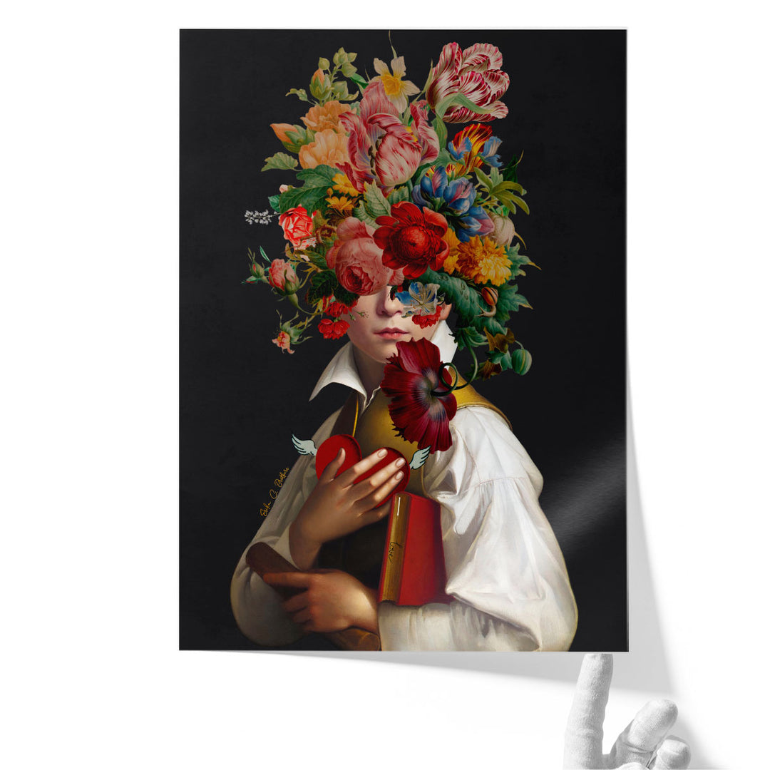 A surreal portrait of a girl in a white dress, her face obscured by flowers, set against a black backdrop.