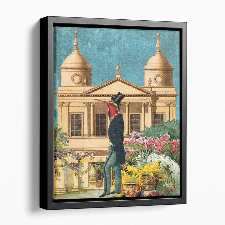 An abstract figure in a black dress stands before a house under a blue sky, blending surrealism and pop art with vibrant tones.