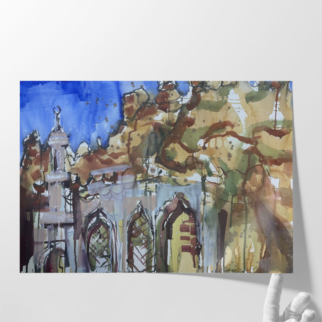 A stunning portrayal of ancient ruins, this artwork in neutral and blue tones highlights the architectural beauty and timeless elegance of ancient structures.