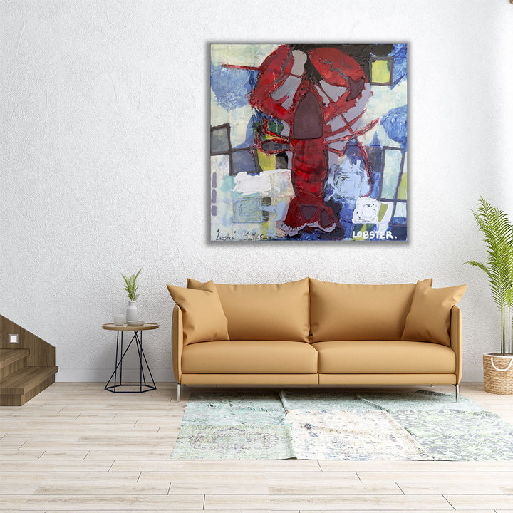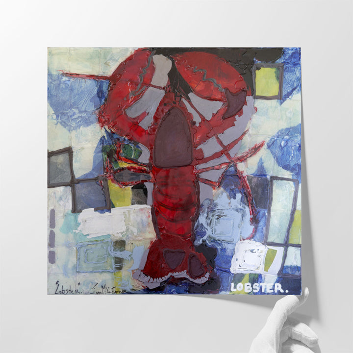 This abstract artwork features a striking red lobster, capturing its vibrant essence through bold and expressive strokes.