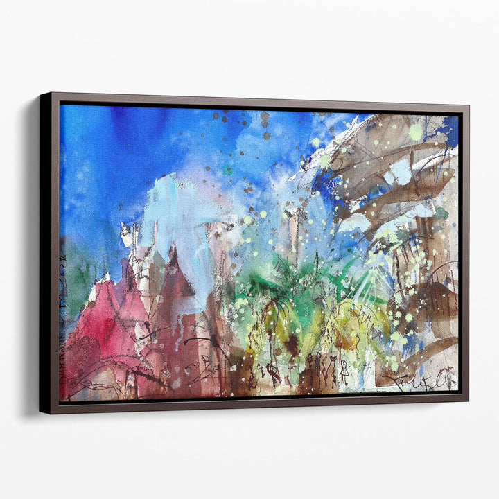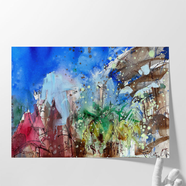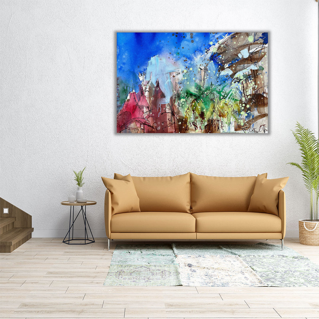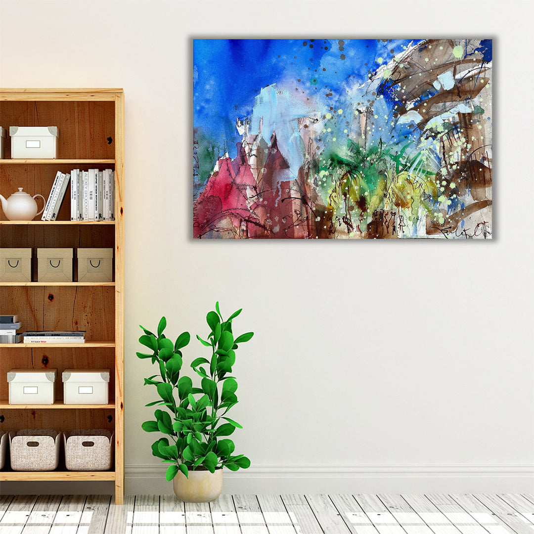 Vibrant watercolor strokes in shades of brown and blue bring the abstract theme to life with a captivating style.
