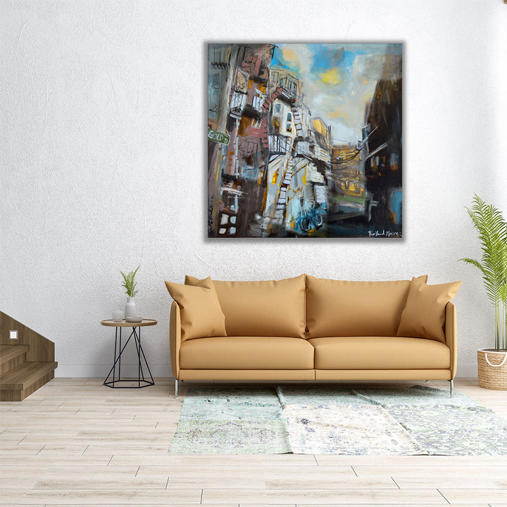 A neutral-toned cityscape in abstract style brings a serene yet dynamic feel to any space.