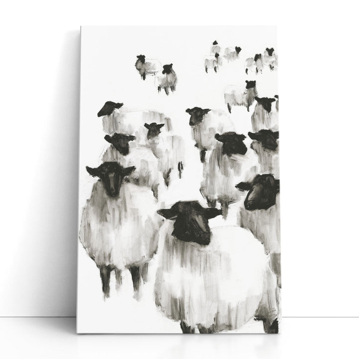 This artwork beautifully depicts serene black and white sheep, capturing simplicity and charm in a tranquil pastoral setting.