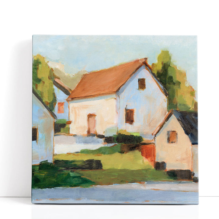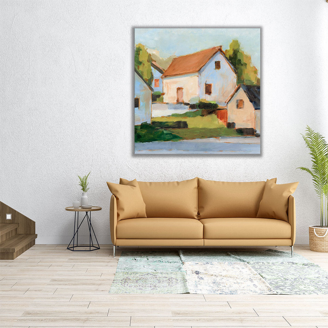 A scenic view of countryside houses and farmland is beautifully depicted, bringing a rustic charm to your décor.