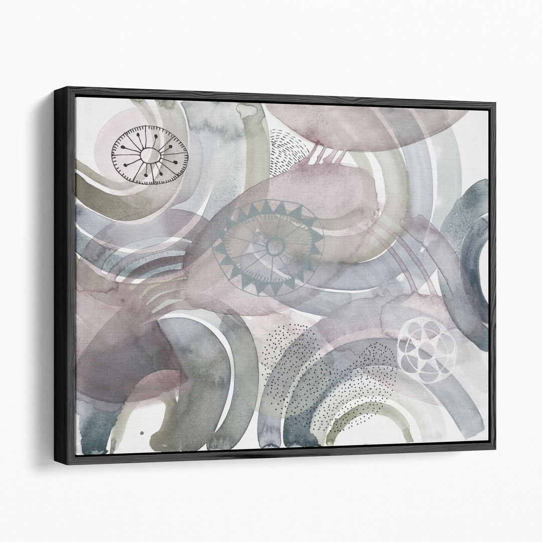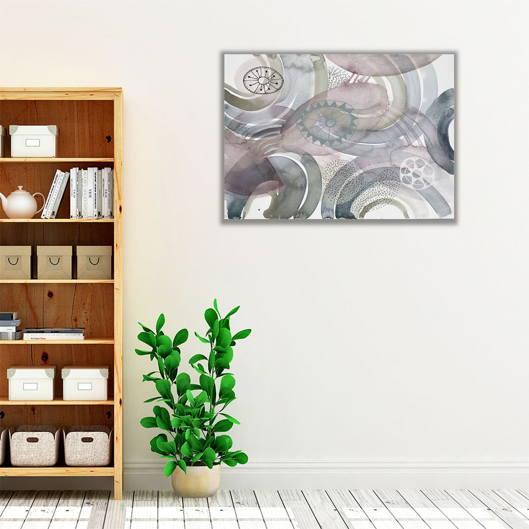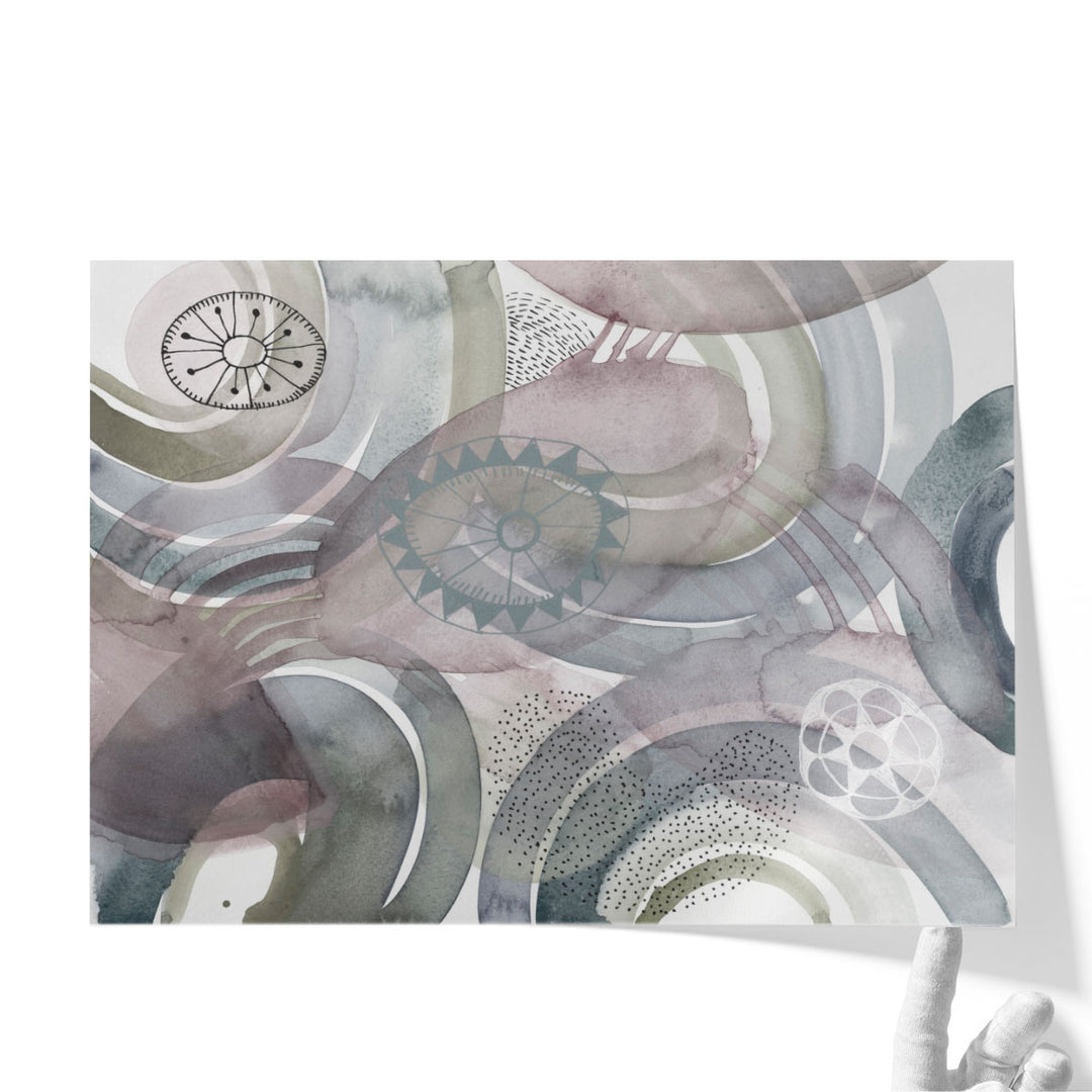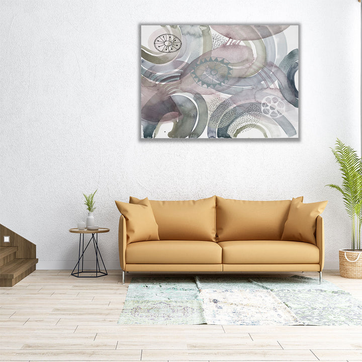 A delicate fusion of abstract forms and watercolor textures unfolds in soothing neutral tones, creating a serene yet dynamic visual appeal.