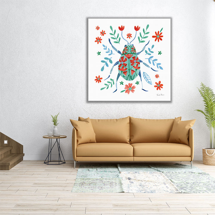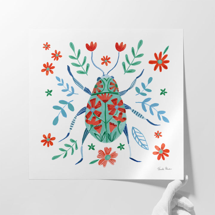 This vibrant piece features a stunning mix of red, white, blue, and green tones, capturing a lively folk-inspired essence.