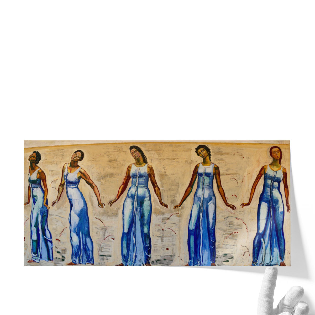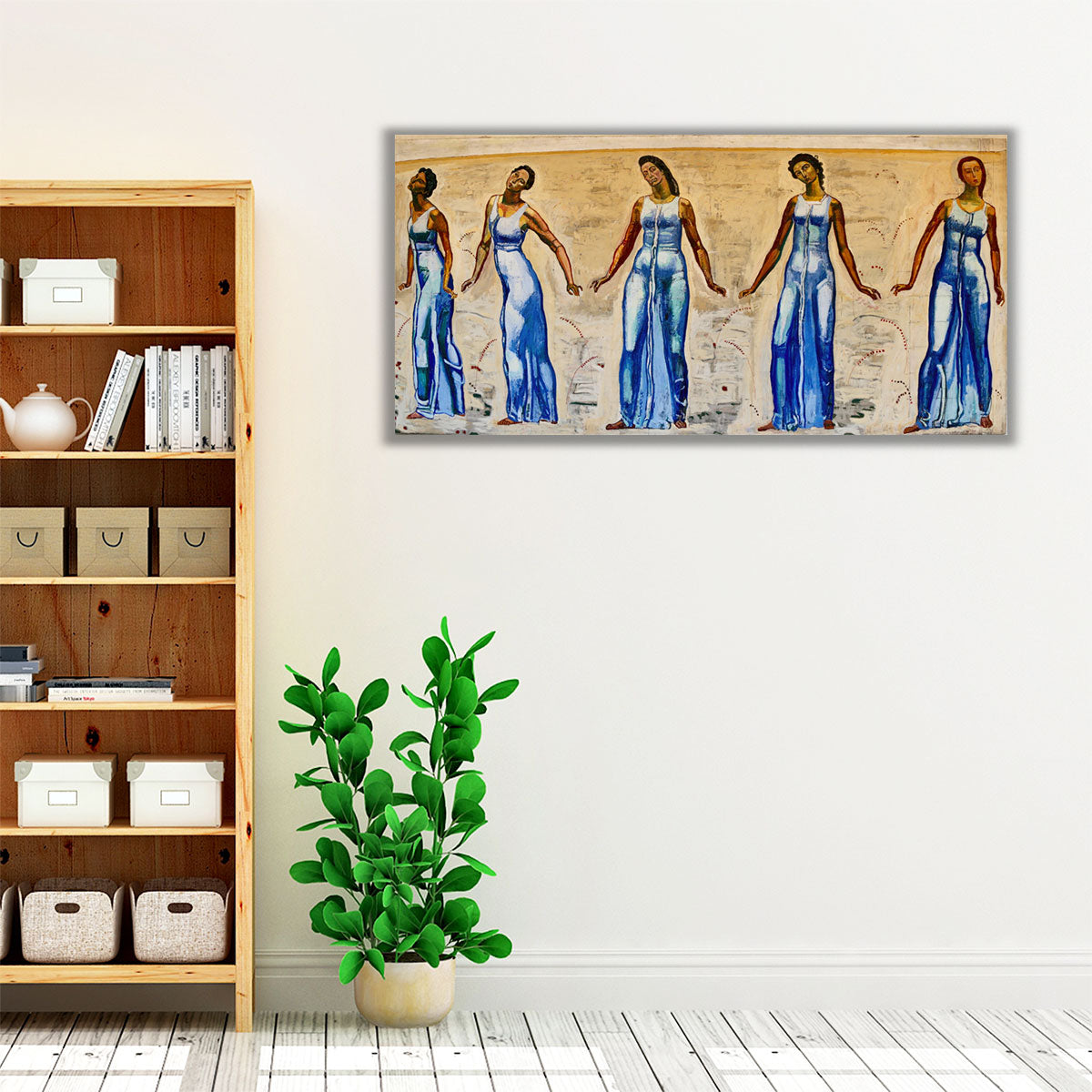 This artwork portrays five women in flowing blue and white attire, arranged in rhythmic harmony, reflecting symbolic style and serene elegance.