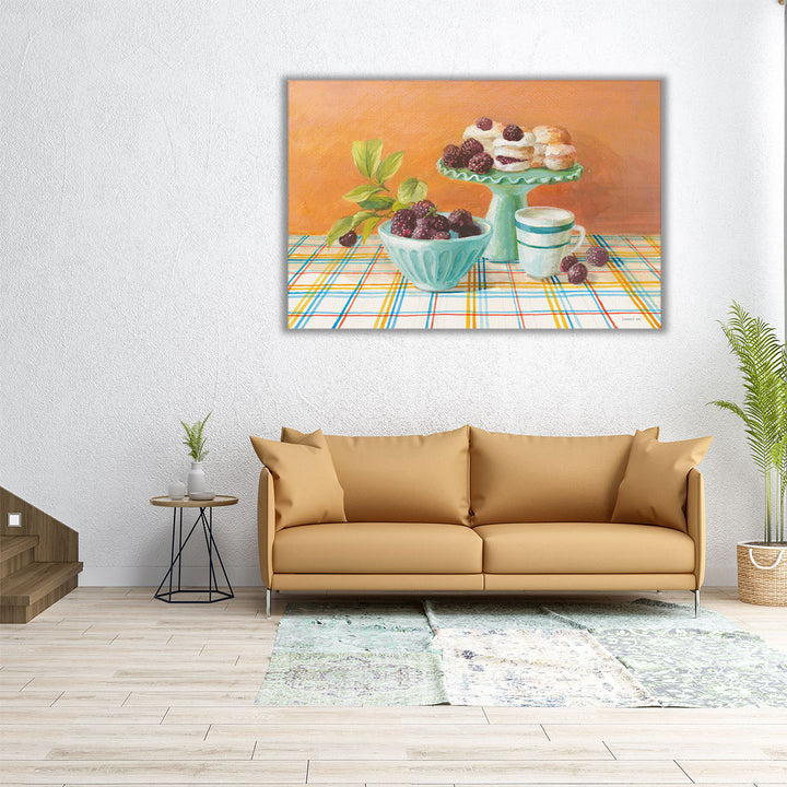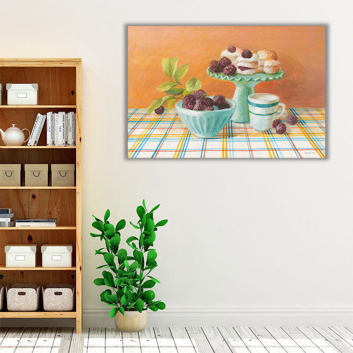This charming artwork depicts a vintage kitchen scene with a vase, cup, and dining elements, evoking a nostalgic and cozy atmosphere.